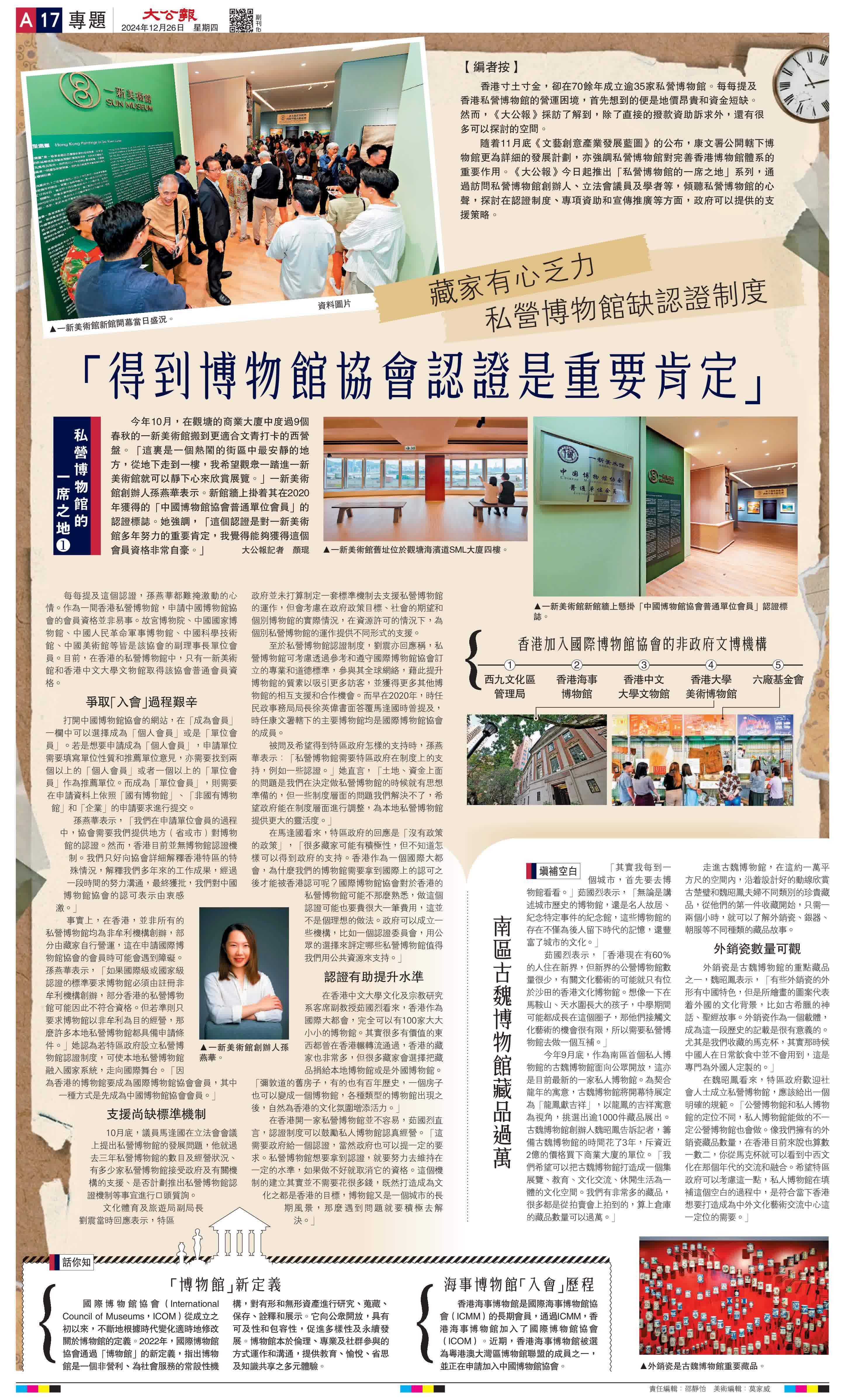 隨着11月底《文藝創意產業發展藍圖》的公布,康文署公開轄下博物館更為詳細的發展計劃,亦強調私營博物館對完善香港博物館體系的重要作用。《大公報》今日起推出「私營博物館的一席之地」系列,通過訪問私營博物館創辦人、立法會議員及學者等,傾聽私營博物館的心聲,探討在認證制度、專項資助和宣傳推廣等方面,政府可以提供的支援策略。