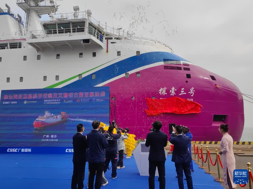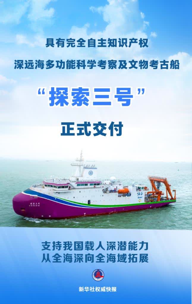 據新華社報道,深遠海多功能科學考察及文物考古船「探索三號」12月26日在廣州南沙正式交付。此船具備完全自主知識產權,是我國首艘具備全球(含極區)深遠海探測和冰區載人深潛支持能力的綜合科考船。