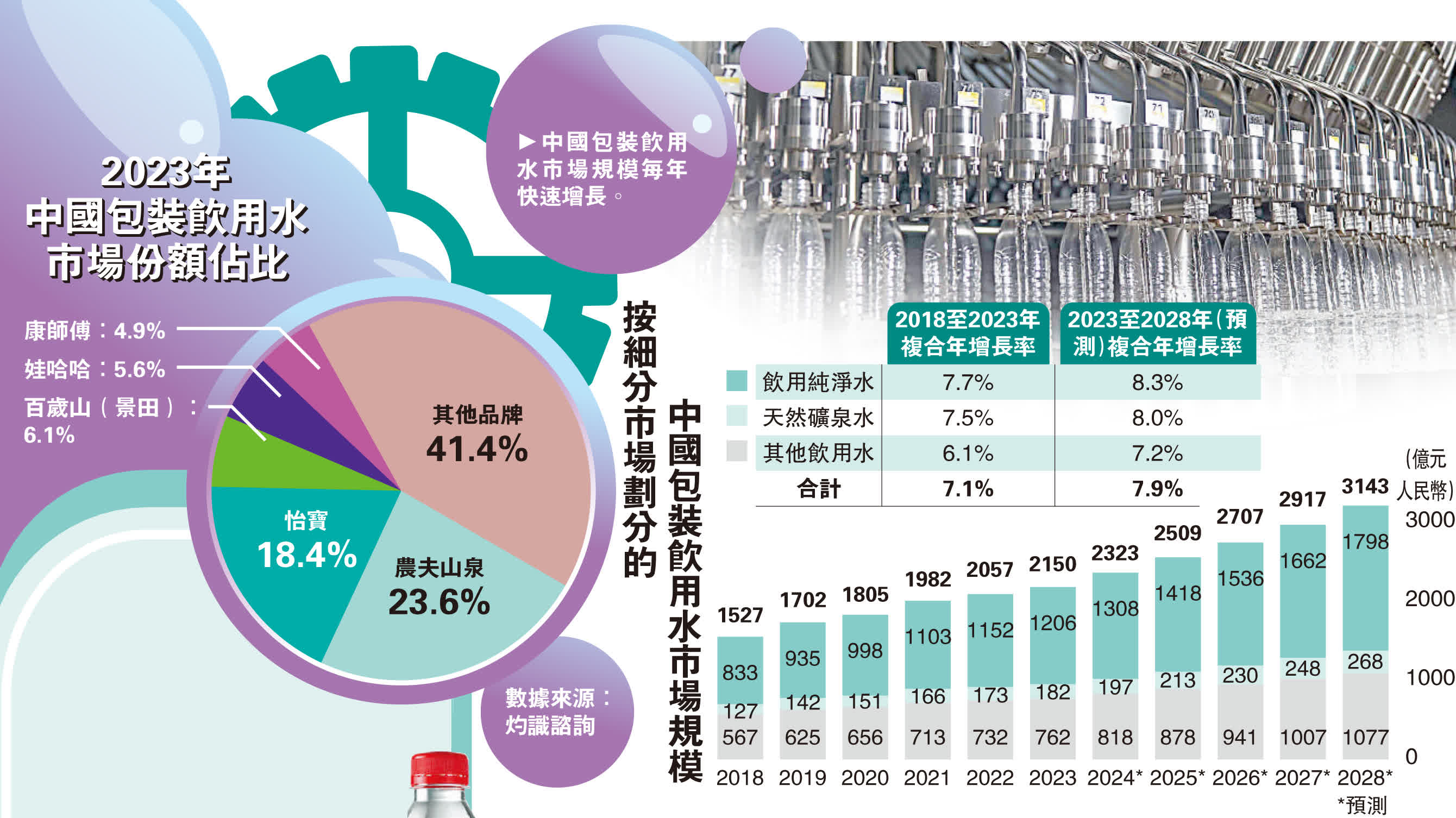 綠瓶純淨水的橫空出世,究竟是不是首富的「賭氣」行為?不少業內人士對此表示懷疑。灼識諮詢報告顯示,2023年中國包裝飲用水市場規模為2150億元人民幣,其中,飲用純淨水佔比56.1%,是最大的細分市場。「就市場佔有率而言,怡寶是農夫山泉最大的競爭對手,在他上市的關鍵節點推出綠瓶純淨水,既能拓展自己的品類,又能從某方面降低市場對怡寶的預期。」
