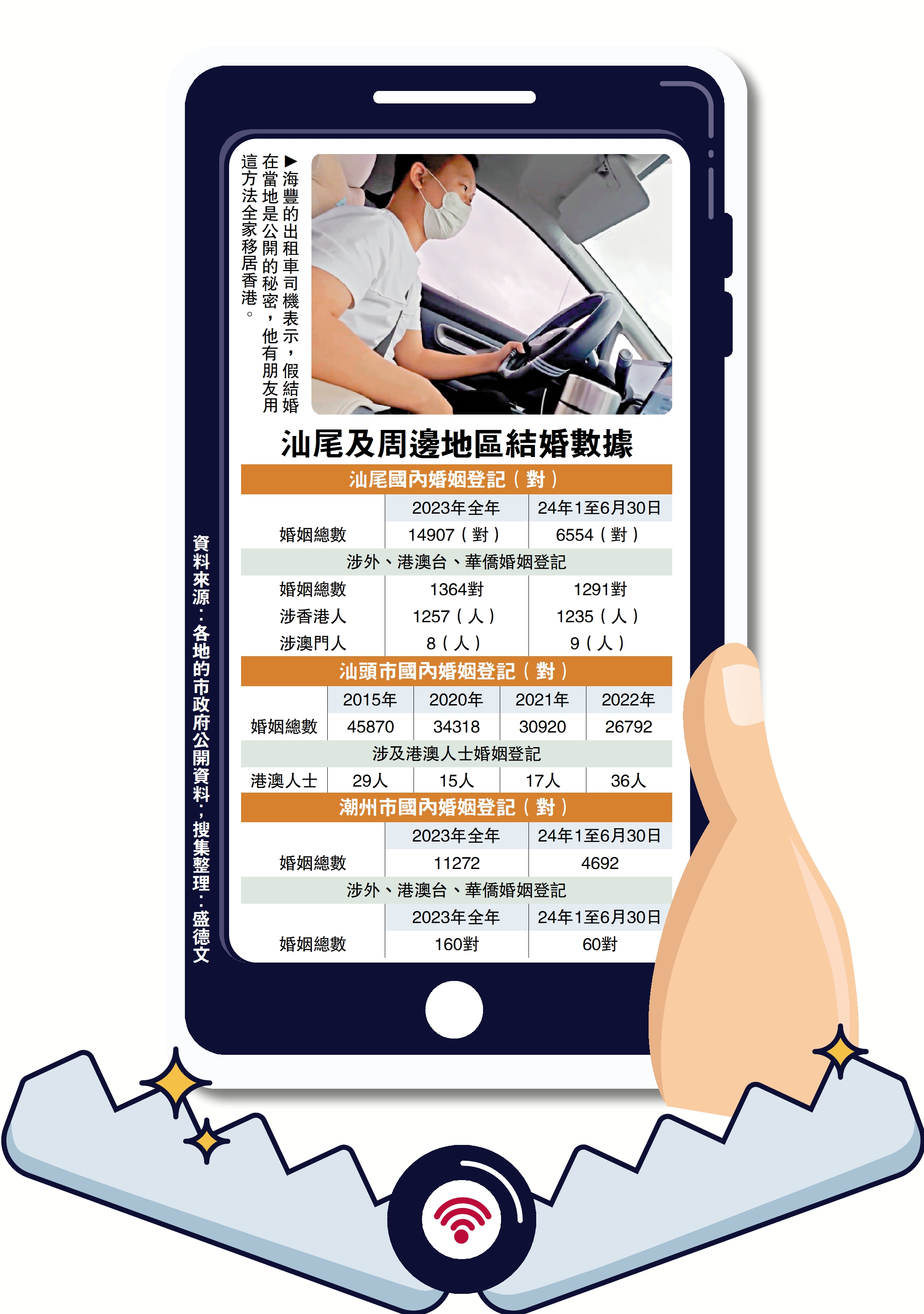 (大公報記者 趙明新)另一名汕尾市的網約車司機對當地很多人經假結婚來香港,形容「好正常」,平日都常聽到坐車的港客聊到假結婚,早已見怪不怪。