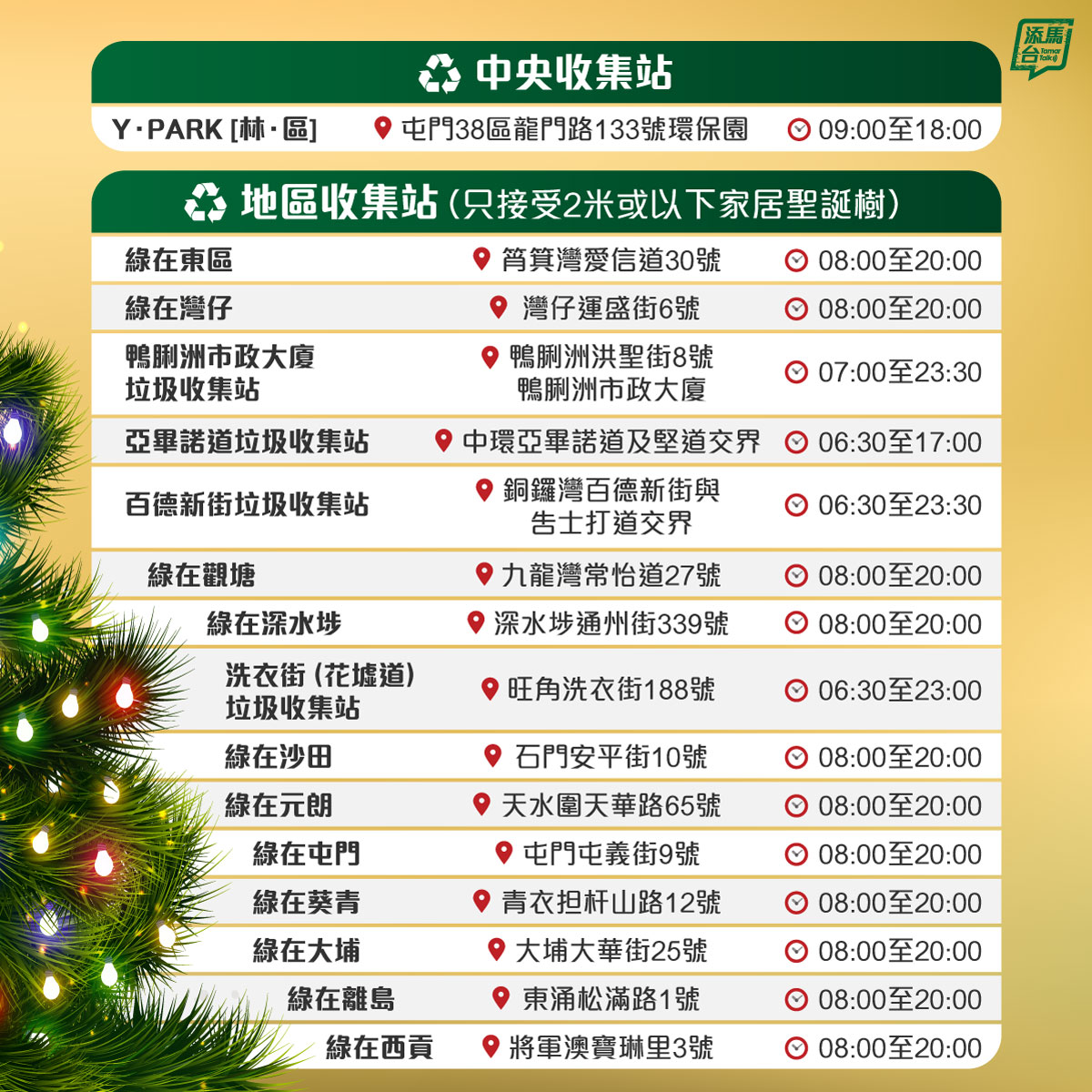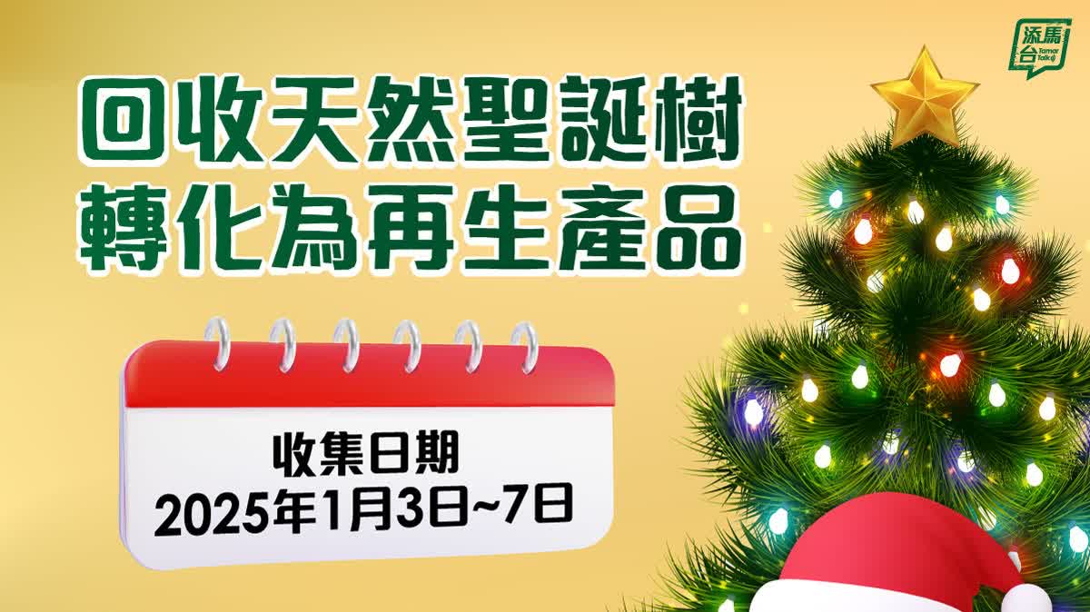 政府提醒,如在2025年1月3日前、1月8日至20日期間需要回收聖誕樹,請於辦公時間內(星期一至星期六,上午9時至下午6時,公眾假期除外)送往Y·PARK [林·區]回收。