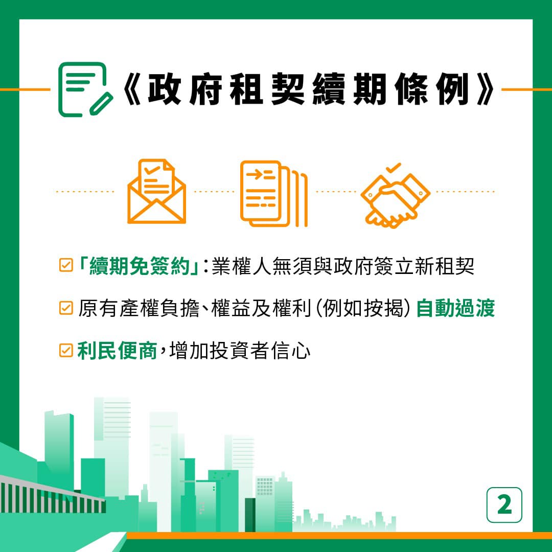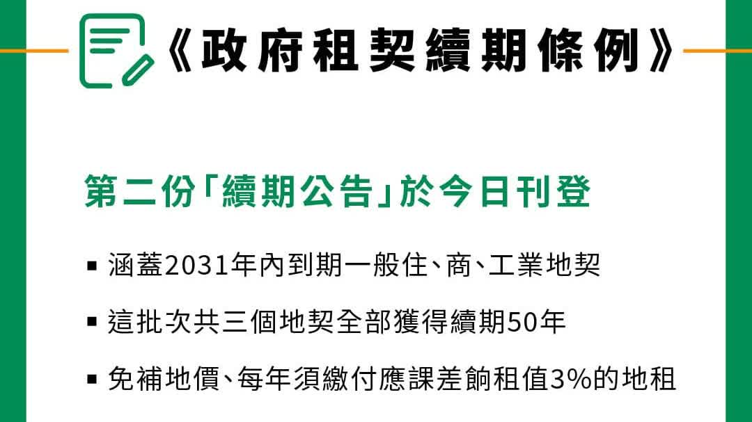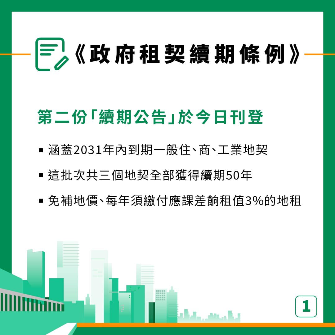 大公文匯全媒體報道,發展局在社交平台發文指,《政府租契續期條例》第二份「續期公告」於今日(27日)刊登,涵蓋2031年內到期的「一般用途地契」,即一般住宅、商業、工業地契,全部獲得續期50年。