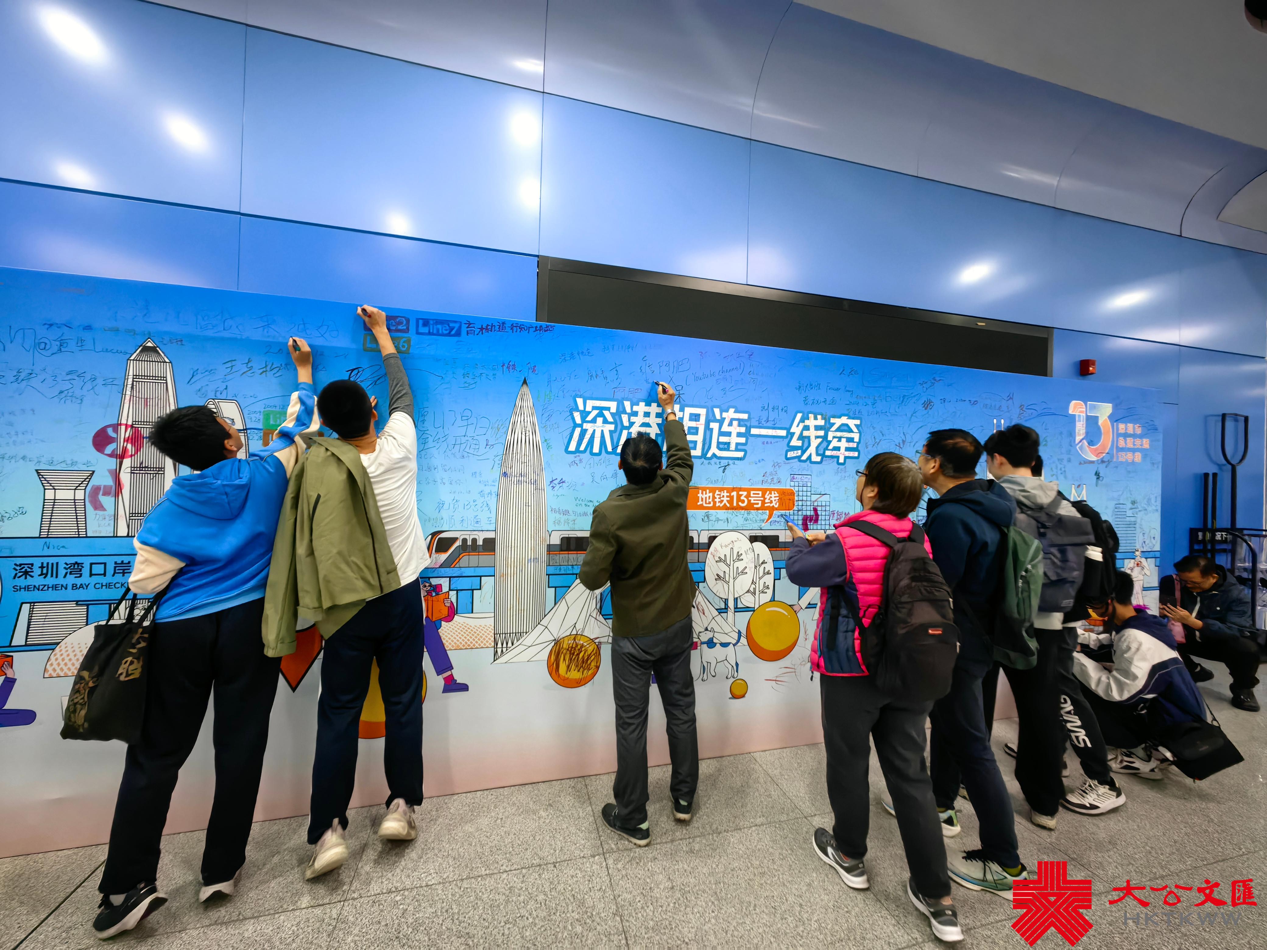 深圳灣口岸站和後海站分別設置了特色打卡點,立體列車車廂的造型復刻了13號線列車,凸顯了深港相連、逐夢灣區的主題,吸引了不少市民圍觀打卡。深圳灣口岸站還設置了塗鴉長圖,以深圳和香港地標性建築為主,市民可發揮創意自由塗鴉,勾畫兩地融合發展的美好祝願。