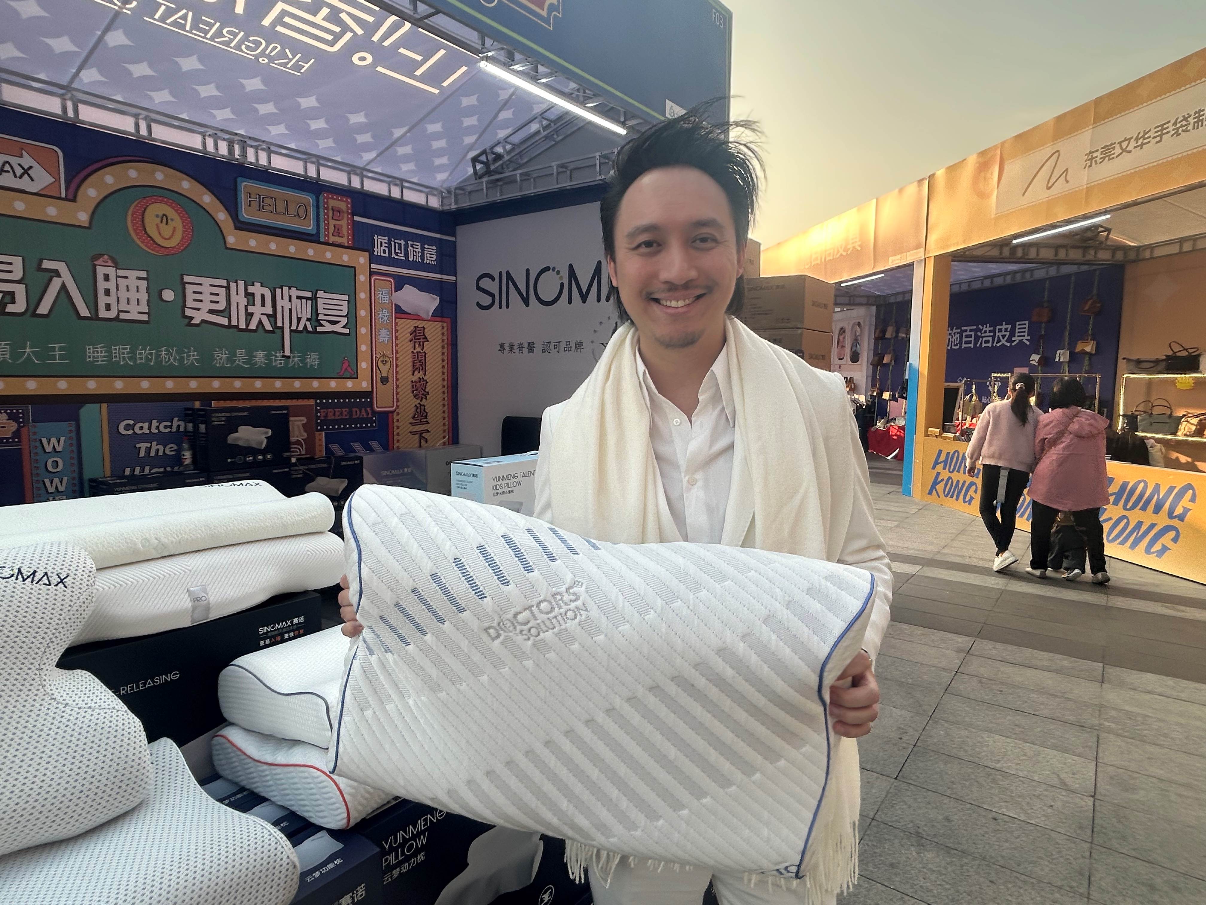 港企SINOMAX賽諾家居是一家致力於枕頭、床墊及健康舒壓用品的生產與銷售的企業,過去幾年,中國出口的枕頭,70%由該公司生產。本次展會,公司帶來了創新研製的數十款太空棉材質的枕頭,能夠有效釋放身體力量,達到頸部肌肉放鬆的效果。展位吸引了大量市民,不少人掃碼下單。