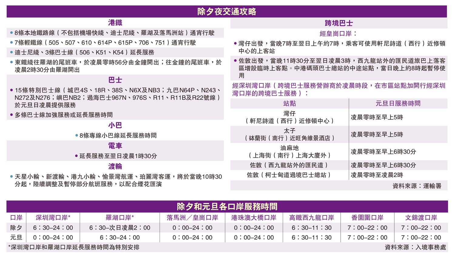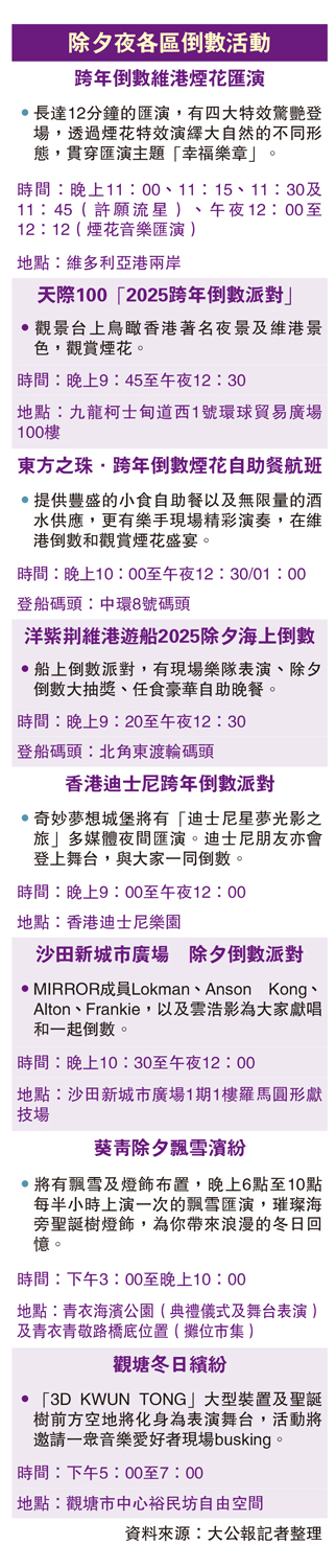 (大公報記者 易曉彤)2025年即將來臨,全港各區均有不同跨年倒數活動,包括維港欣賞煙花匯演、船上自助餐、餐廳倒數派對、商場倒數活動等,盡顯節日氣氛。港鐵將提供通宵服務,多條巴士路線亦將延長服務時間,市民和遊客都可玩盡興,在歡樂中迎接新一年!