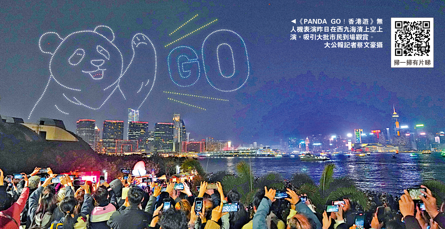 本港首次以無人機搭載煙火、以熊貓為主題的《PANDA GO!香港遊》無人機表演,昨晚8時15分在西九文化區海濱上空上演,合共1000架無人機交織變換出多款生動活潑的熊貓圖案,以及極具香港特色的圖案,當中有三幕結合煙火效果。