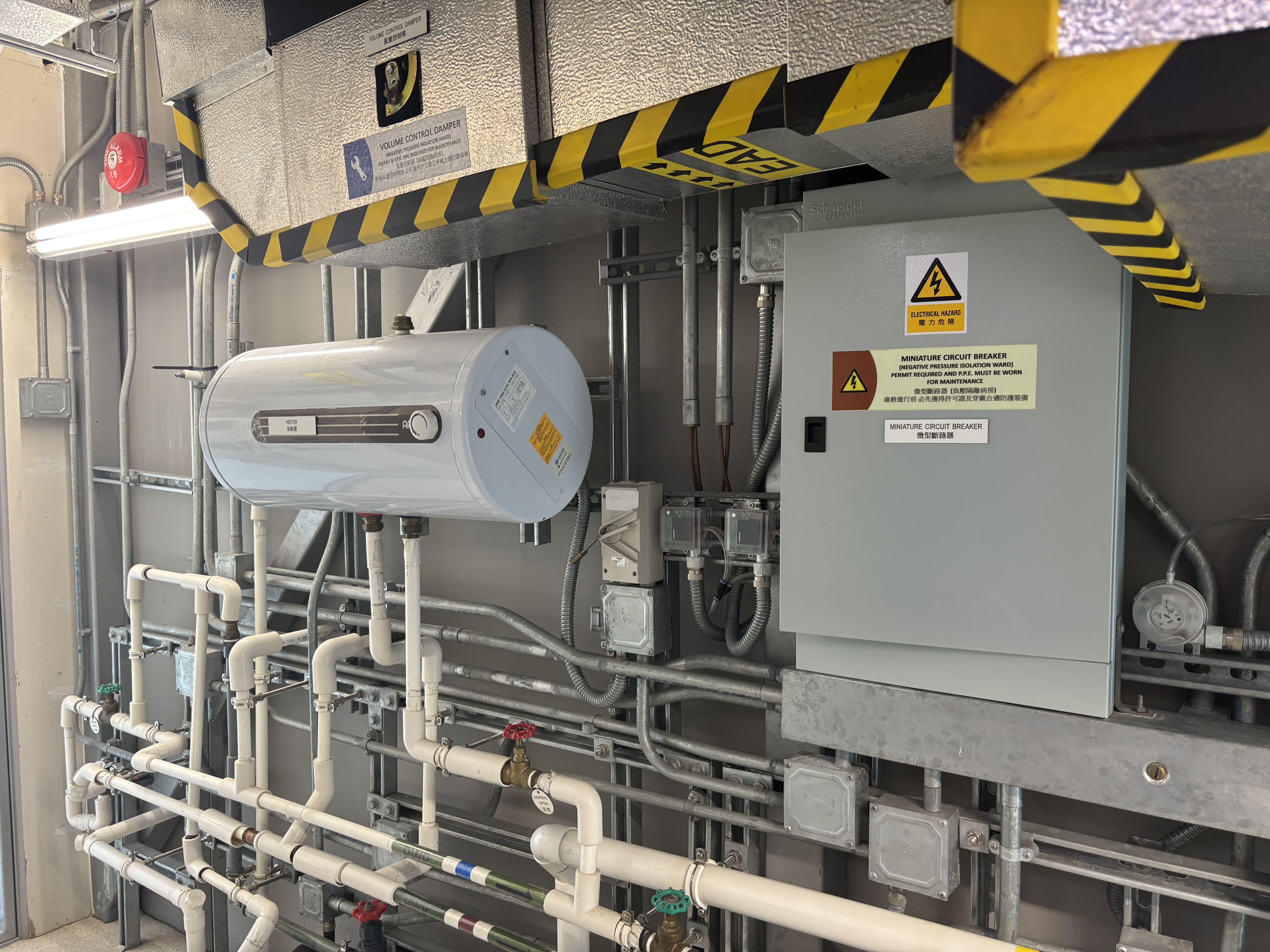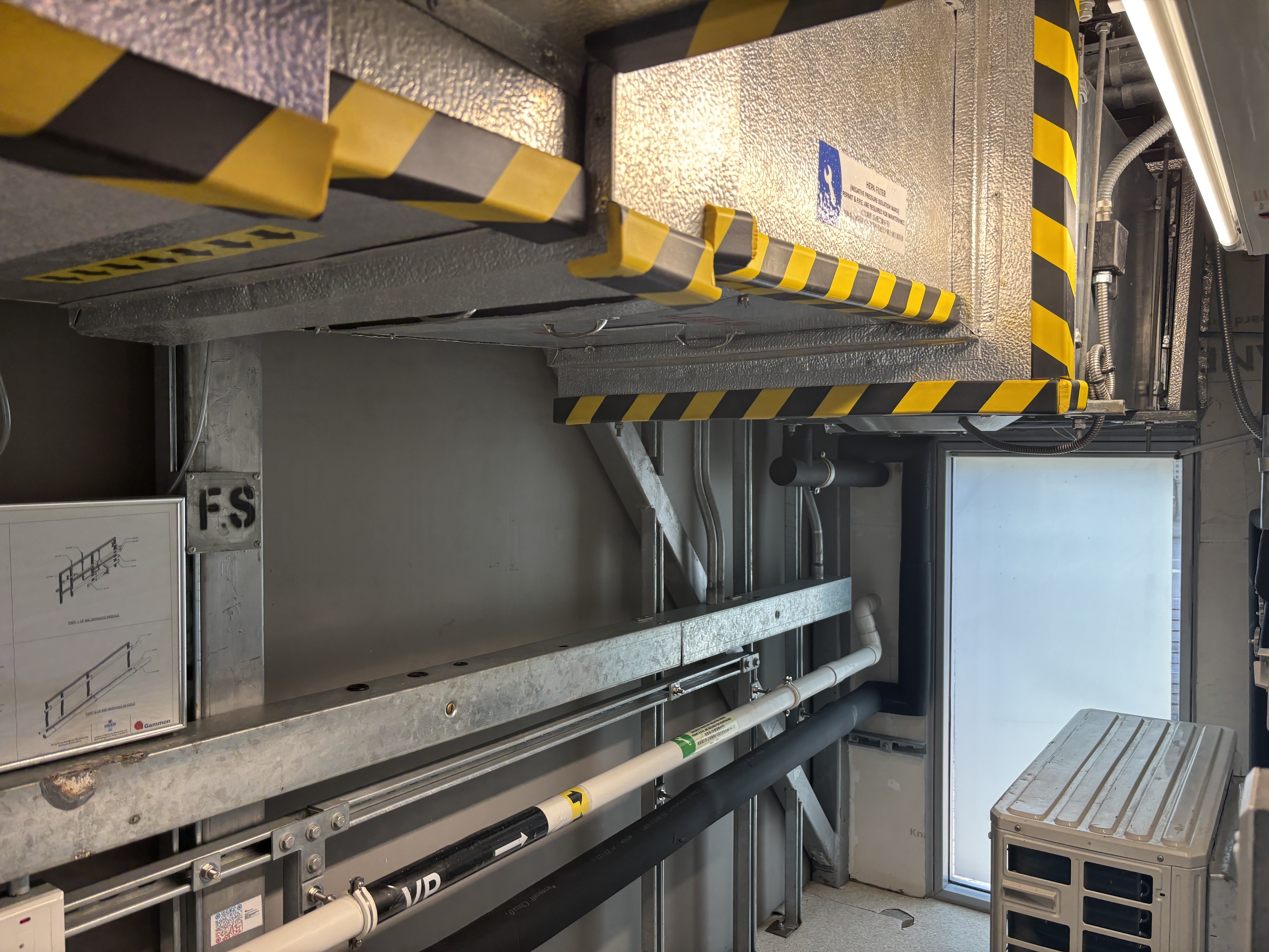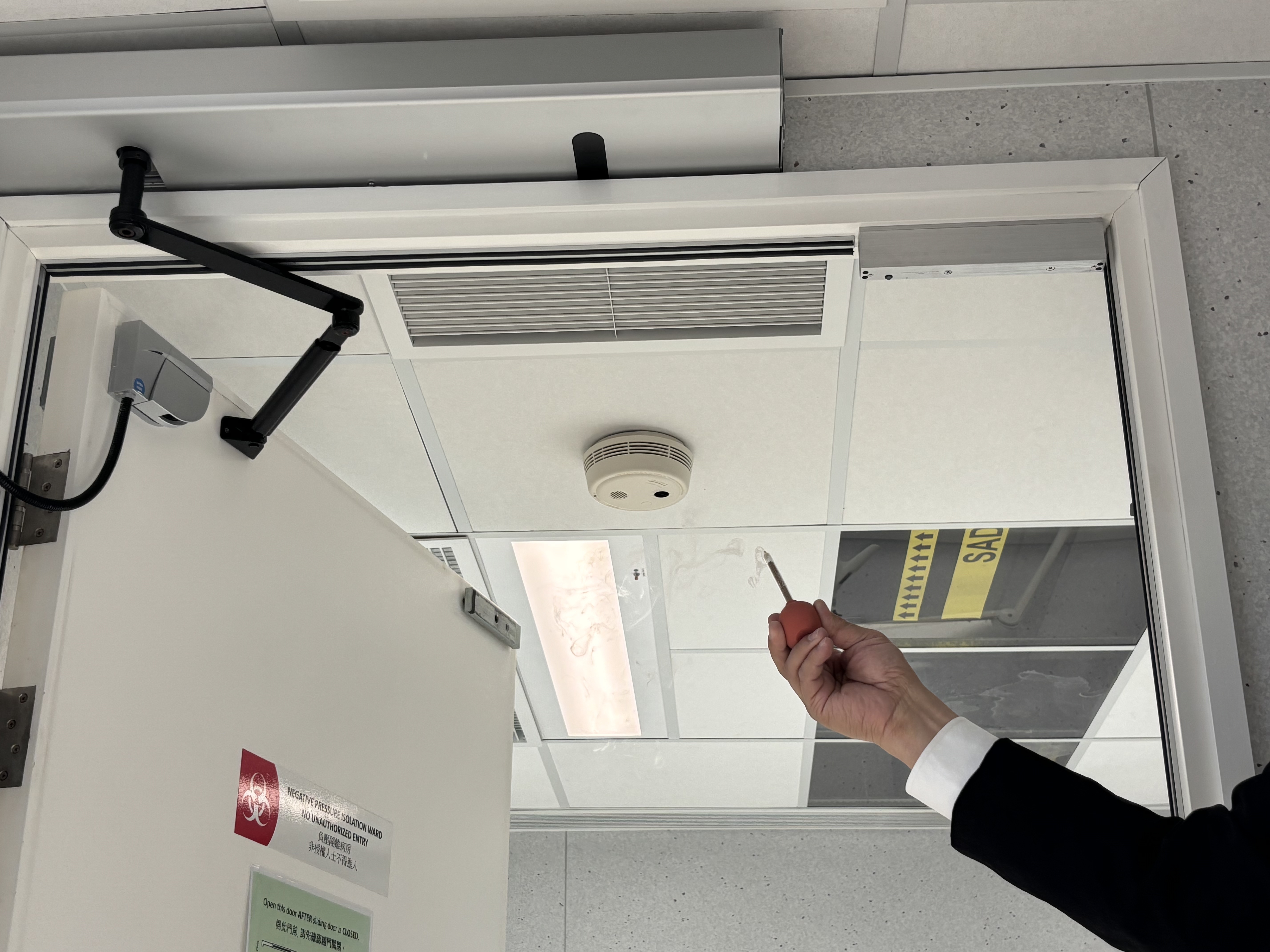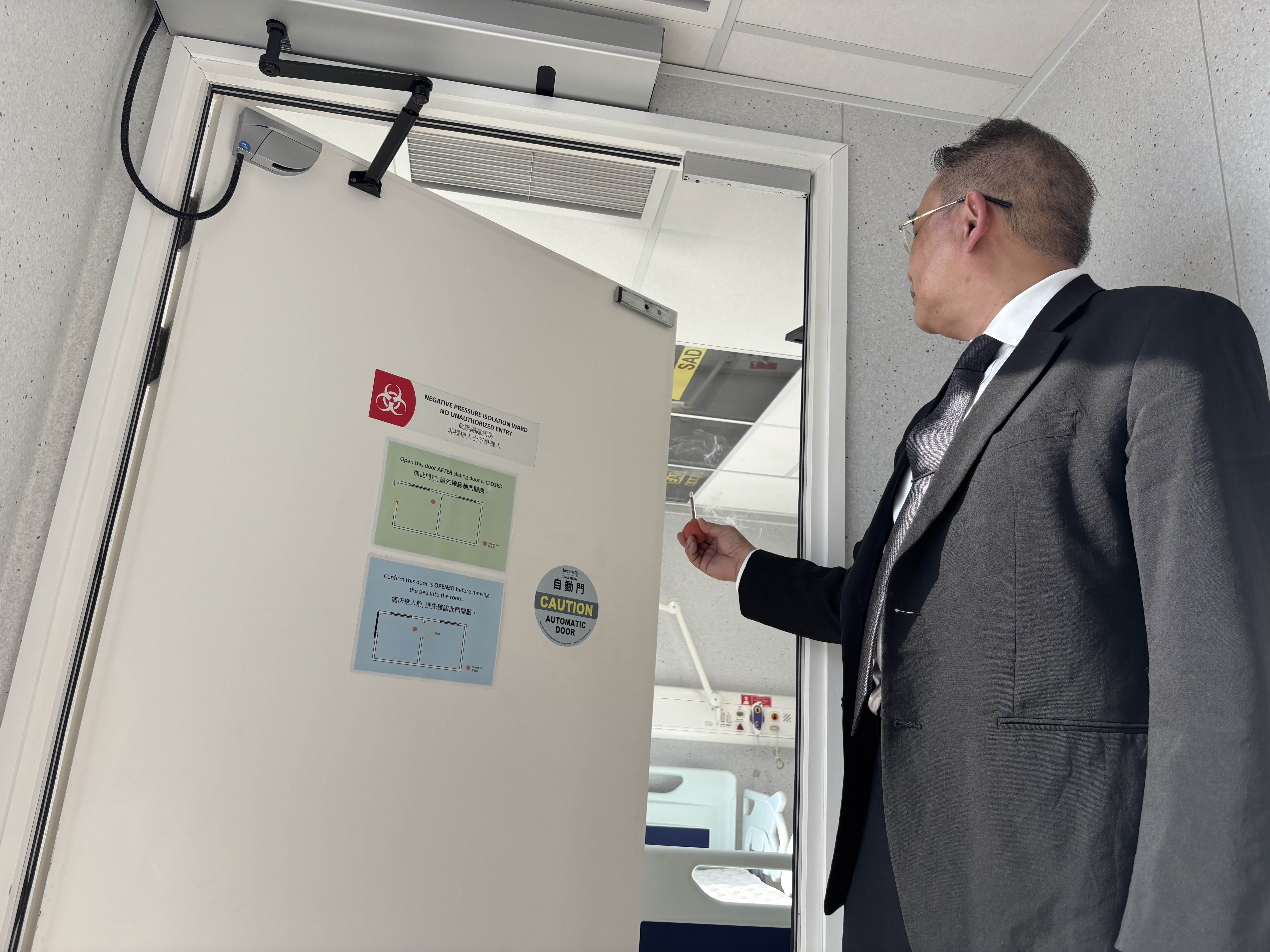 源栢樑介紹,高規格負壓隔離病房並不是簡單的方艙,其有雙重門的設計,每次僅能開啟一道門,並通過工程手段,製造氣流控制,抽風量多、送風量少,製造向病房流入的方向,阻止病房內不潔的空氣流出室外,並運用送進來的風稀釋病房內空氣。他形容這個病房為「麻雀雖小,五臟俱全」。