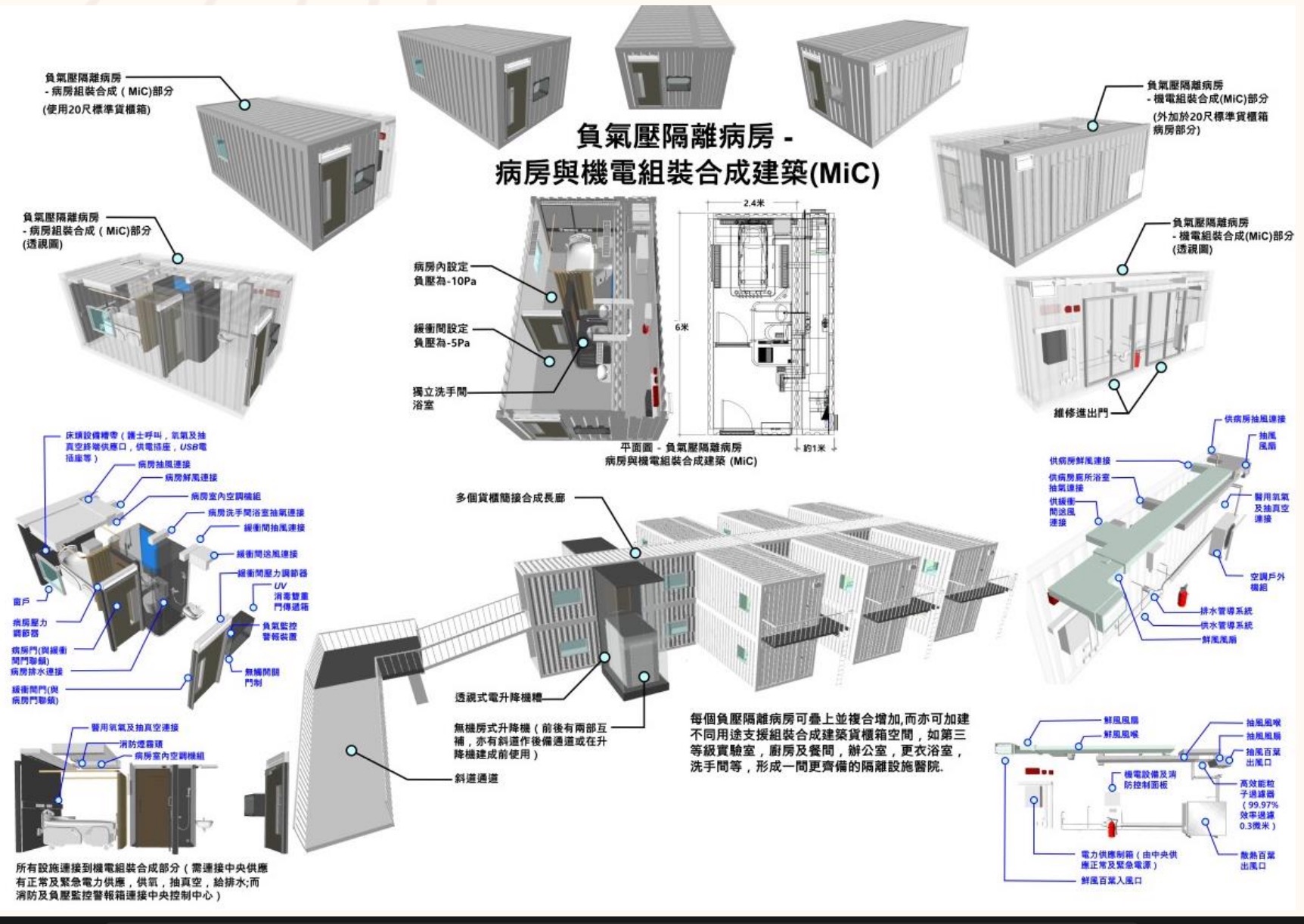 該項目採用先進的「組裝合成」(MiC)建造技術,以貨櫃為單元,每個病房成本約200萬港元,建造周期僅需約一個月,工期可以縮短30%-50%。MiC技術允許近八成的工序在工廠預製完成,再運至現場快速組裝和調試,顯著縮短了建造時間,並確保了工程質量。經嚴格的醫療測試和演習驗證,這些病房能提供高效的負壓隔離環境,有效阻斷高傳染性病原體的傳播。項目採用先進的MiC建造技術配以「機電裝備合成法」(MiMEP)的兩種現代建築方法相輔相成,共同提高建築效率、質量和可持續性。而隔離病房設計的特點是不需外置大量風喉等的中央空調系統支援,以MiMEP內藏的通風空調自給自足形成所需的空氣流向設計,得以有效控制感染。