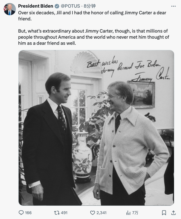美國現任總統拜登和第一夫人吉爾·拜登就吉米·卡特去世發表聲明哀悼。拜登表示,世界「失去了一位傑出的領導人、政治家和人道主義者」。拜登稱:「60多年來,吉爾和我有幸和吉米·卡特成為親密的朋友,然而,吉米·卡特的非凡之處在於,美國乃至全世界數百萬從未見過他的人也把他視為親密的朋友。」