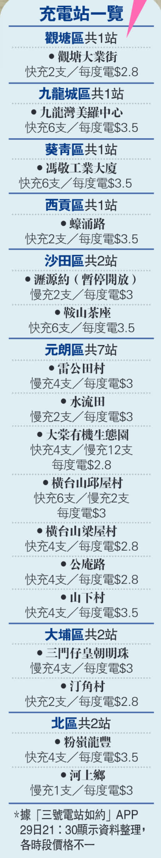 大公報記者下載「如約充電」專用手機APP「三號電站如約」,發現目前APP上顯示在九龍及新界8區設有17個新能源車充電站(詳見表),現時有快充及慢充兩種電樁供使用,電樁使用狀況、每度電力收費、免費停車條款、服務商優惠等資訊實時更新,一目了然。