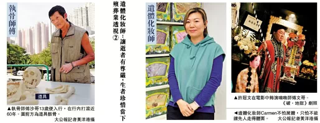 (大公報記者 劉碩源)殯葬行業有不同崗位,作為需要近距離接觸先人遺體及骸骨的化妝師及執骨師,職業彷彿帶有不少神秘色彩,被不少人視之為唯利是圖、厭惡性職業。然而執骨師傅沙哥及遺體化妝師Carmen都認為,雖然改變不了外界的誤解,但一定要尊重自己的專業、尊重先人。Carmen直言,「我不害怕遺體,我更害怕我不能讓他們體面走完最後一程」。