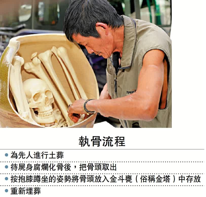 「執骨」是中國華南地區的殯葬傳統,在香港,一般於先人土葬六年後把先人的骸骨「執起」,放入金塔。沙哥表示,入行關鍵在於細心、耐心,務必做到「齊齊整整」。