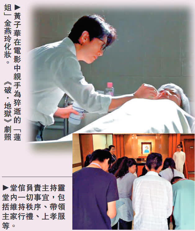 •安排靈堂的儀式,包括排花圈、幫主家上孝服、教家屬回禮、不同家鄉的殮葬、大殮、出殯儀式等。
