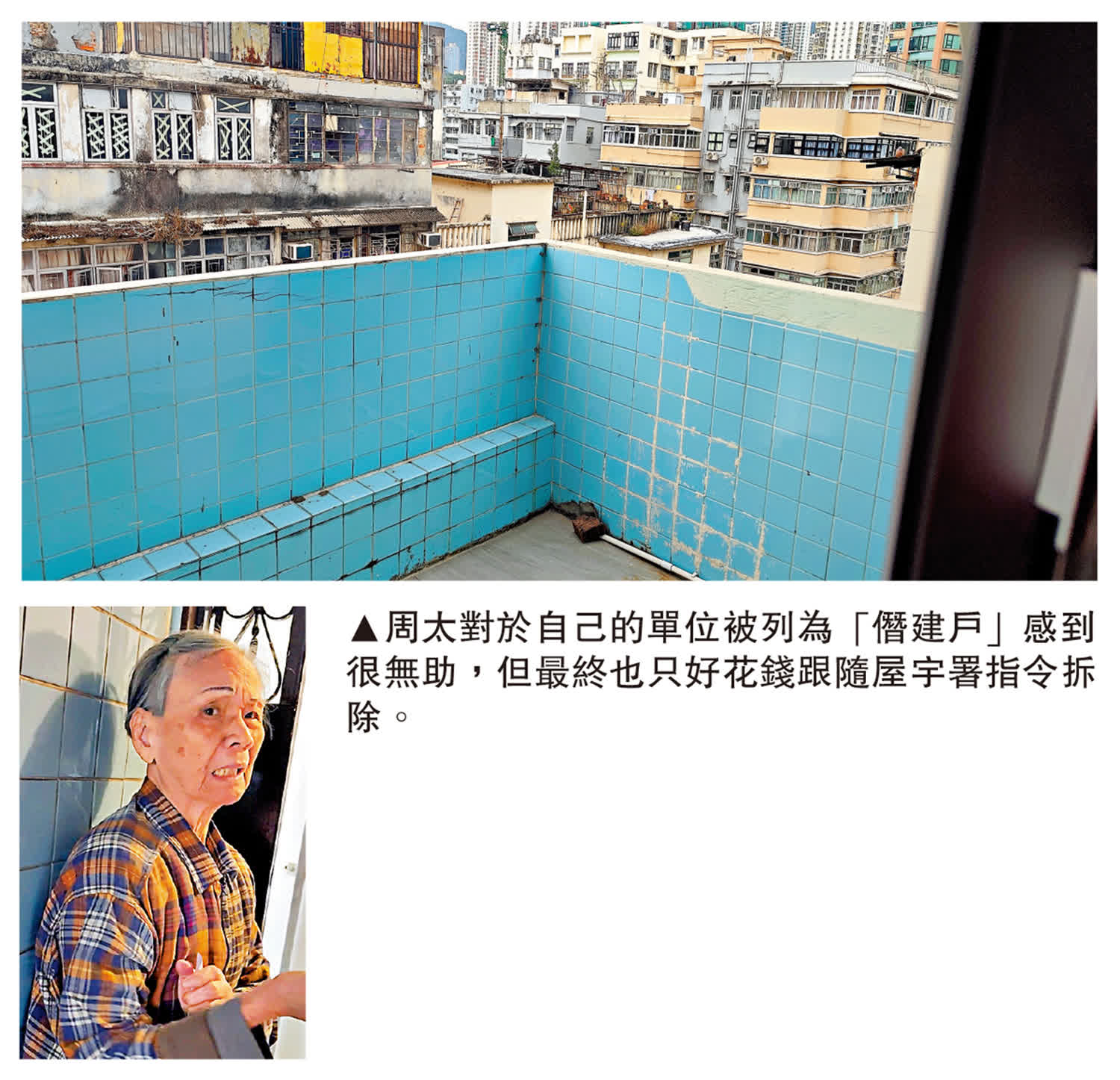 其中一名業主85歲周太,2019年大廈收到要求拆除8至12樓的僭建部分,她在20多年前購入單位時不知道有僭建物,對於自己的單位被列為「僭建戶」感到很無助,但最終也只好跟隨屋宇署指令拆除。大公報記者早前找到周太,她居住的單位已經拆除僭建部分,原本被列為僭建部分的天花板及室內已經變成露台,其丈夫在今年2月因病去世,和兒子一起居住。