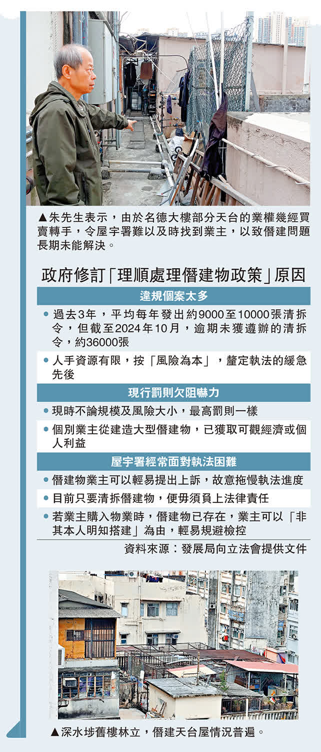 (大公報記者 盛德文、古倬勳、葉浩源)香港僭建問題存在已久,不少舊區普遍存在天台屋、簷篷等僭建問題,嚴重威脅公眾安全。現時本港未有遵辦的清拆令約有36000張,當中逾五成屬大型僭建物,盡快清拆迫在眉睫。