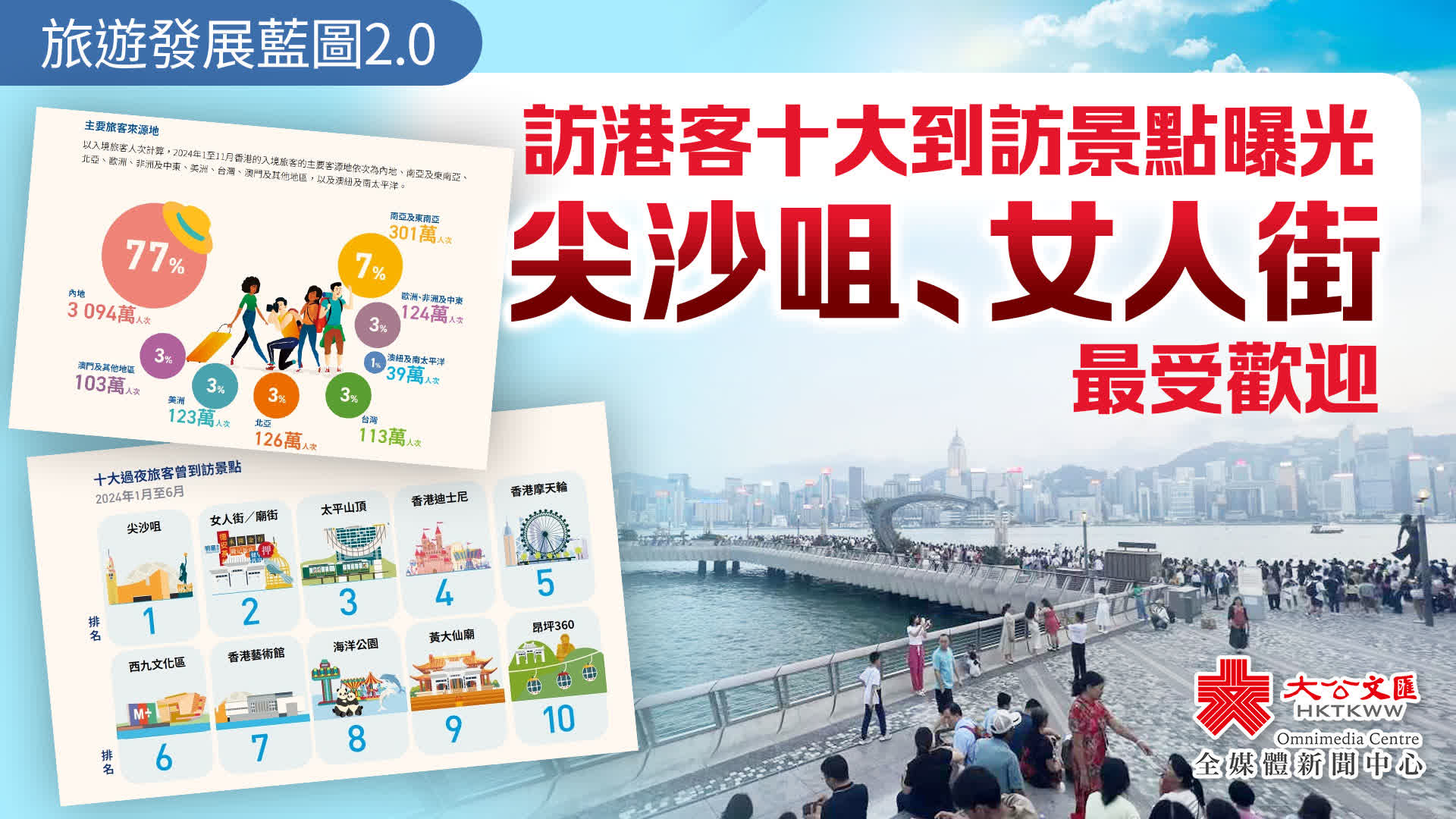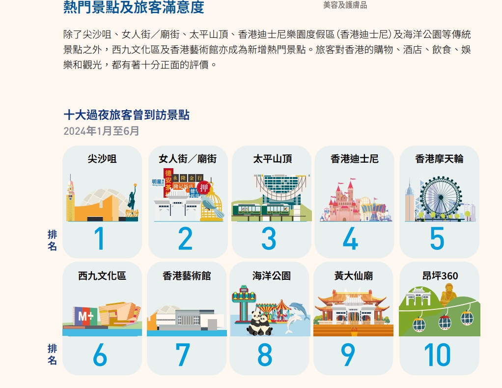 藍圖中亦統計了今年上半年十大過夜旅客到訪景點,除了尖沙咀、女人街/廟街、太平山頂、香港迪士尼及海洋公園等之外,西九文化區及香港藝術館亦成為新增熱門景點。