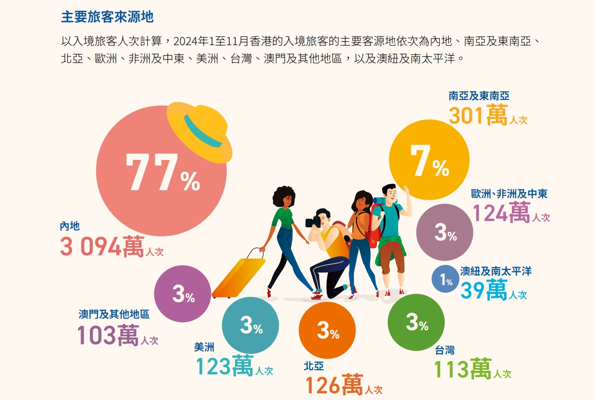 首11個月中,入境旅客的主要客源地依次為內地、南亞及東南亞、北亞、歐洲、非洲及中東、美洲、台灣、澳門及其他地區,以及澳紐及南太平洋。約4000萬入境旅客人次中,接近8成來自內地,共有3094萬人次。南亞和東南亞位居第二,佔7%,有約300萬人次。北亞、美洲、澳紐及太平洋、台灣和澳門及其他地區則各佔3%,有超過100萬人次。