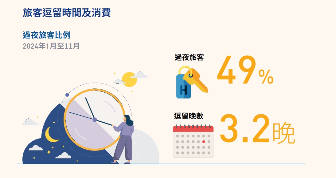 至於旅客逗留時間及消費,有49%旅客選擇在港過夜,平均逗留3.2晚,其人均消費約為5500港元。過夜旅客在購物上消費最多,約2200元,酒店和餐飲則分別佔據1400元和1100元。至於不過夜的旅客,人均消費則是約1200元。