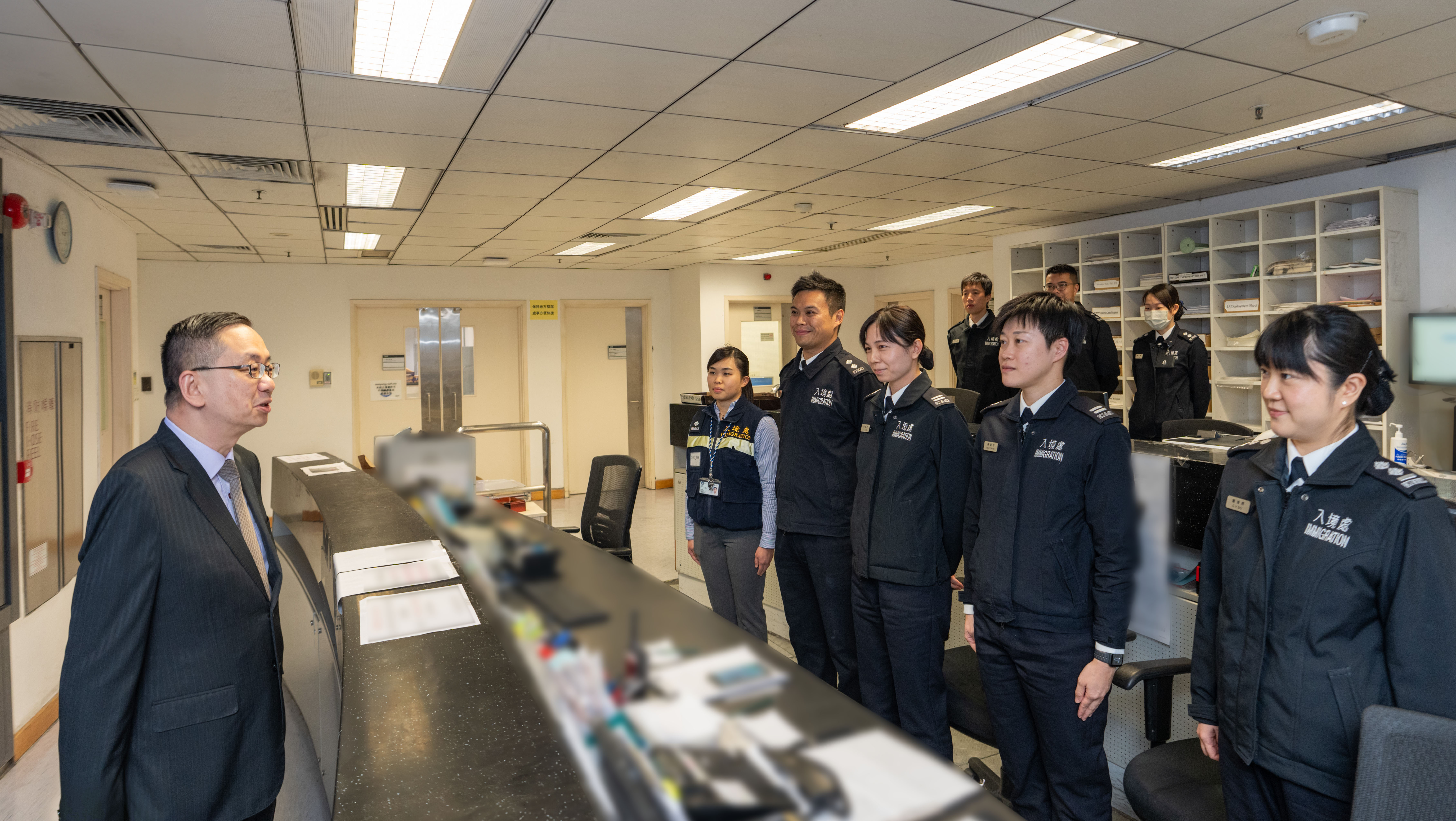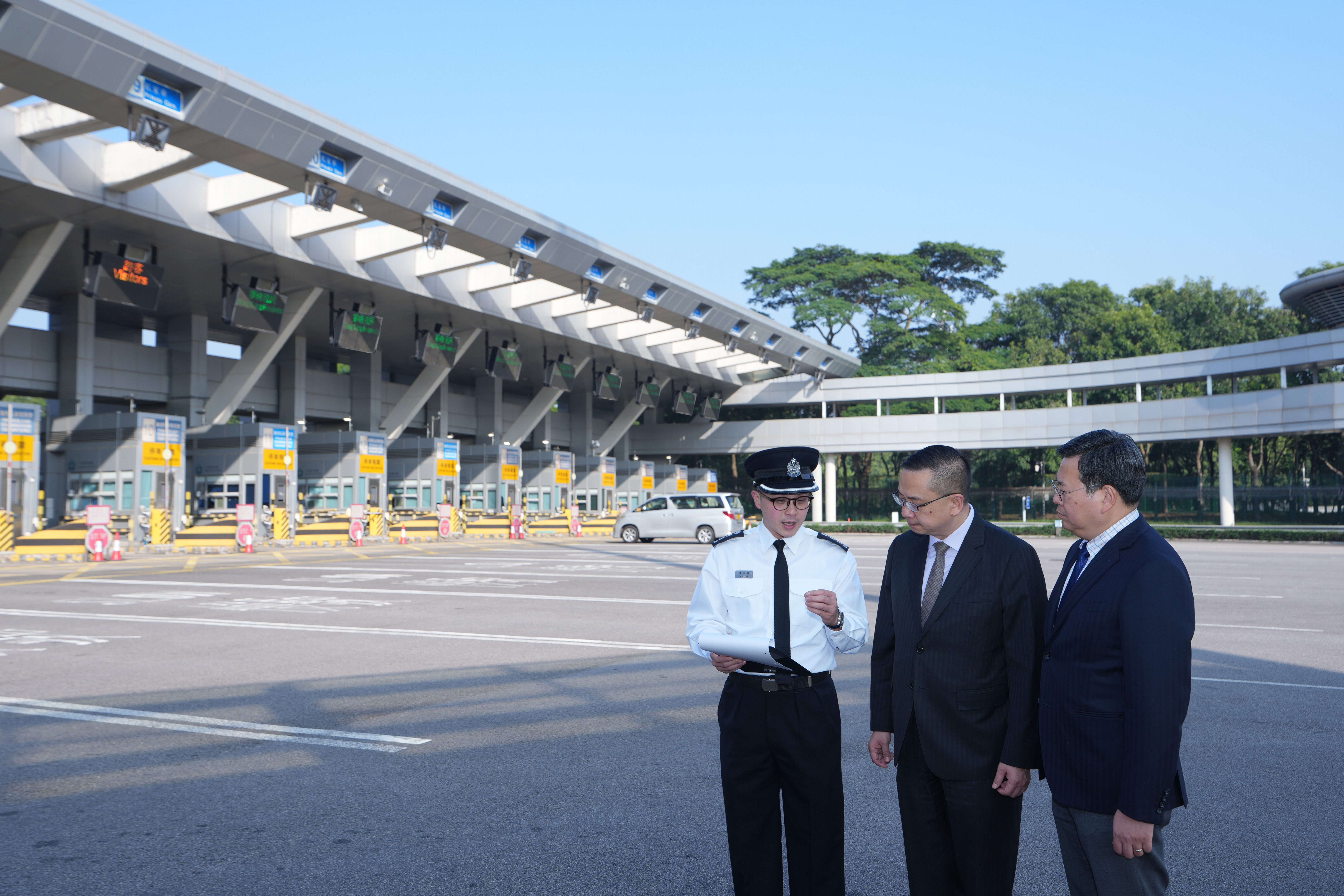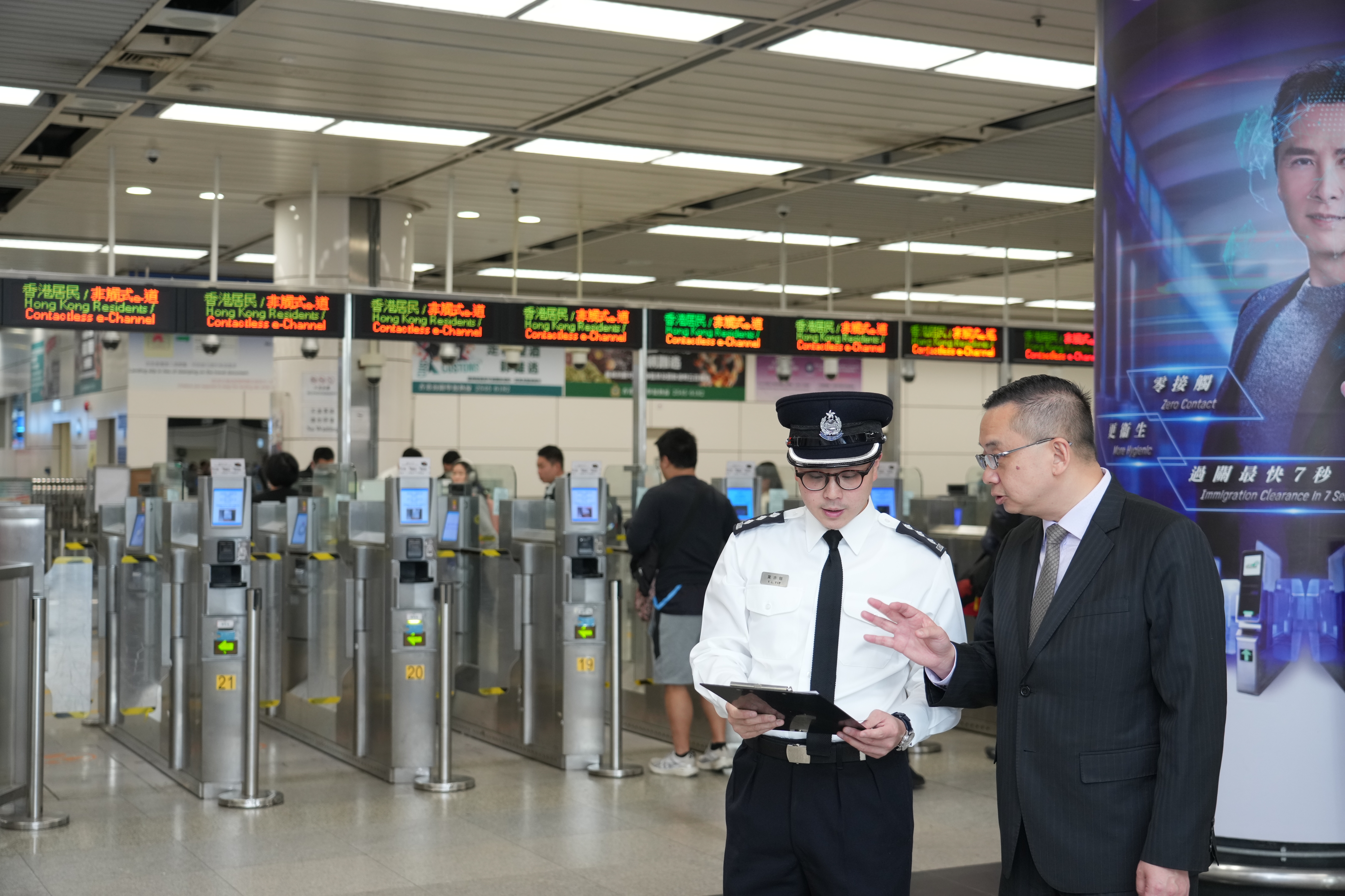 郭處長及樊助理處長(管制)今天到了深圳灣管制站視察,瞭解管制站延長通關的準備工作,指示管制站同事必要時啓用全部檢查櫃枱及通道,以疏導人流及車流,並為同事打氣。