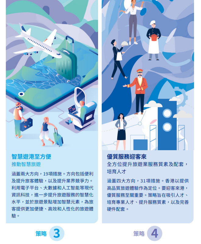 涵蓋31項措施。香港以提供高品質旅遊體驗作為定位,迎客來港,優質服務至關重要。策略旨在吸引人才入行、培育專業人才、提升服務質素和完善硬件配套。