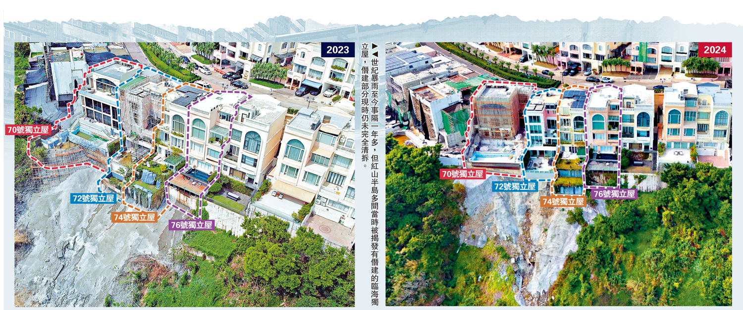 大公報記者在上周三(25日)到紅山半島查訪,發現在當日發生山泥傾瀉山坡附近的70、72、74號獨立屋,對下的斜坡已完成加固工程。不過,記者對比去年事發後的圖片,發現涉事的該三間屋及旁邊的76號屋,僭建的地牢仍紋絲未變,一直保存完好。