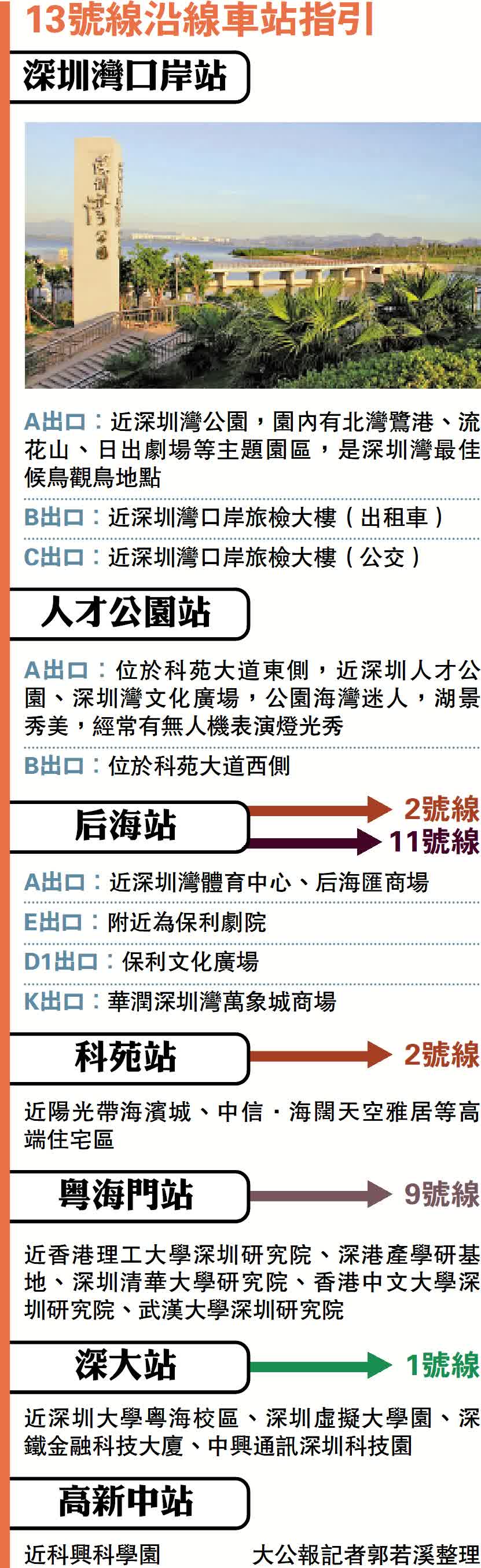 13號線已開通的7站,可謂「站站有亮點」。其中,粵海門、深大和高新中三個站位於南山科技園片區,靠近深圳大學粵海校區、香港理工大學深圳研究院、香港中文大學深圳研究院等多間高校及科研機構。該線路的開通也極大的便利了兩地高校職員、研究人員和學生的往來。在香港中文大學深圳研究院工作的港人周先生告訴記者,他每周經深圳灣口岸往返深港,之前坐的士出行,在口岸等半個多小時是常事。如今13號線直達研究院,方便了許多。