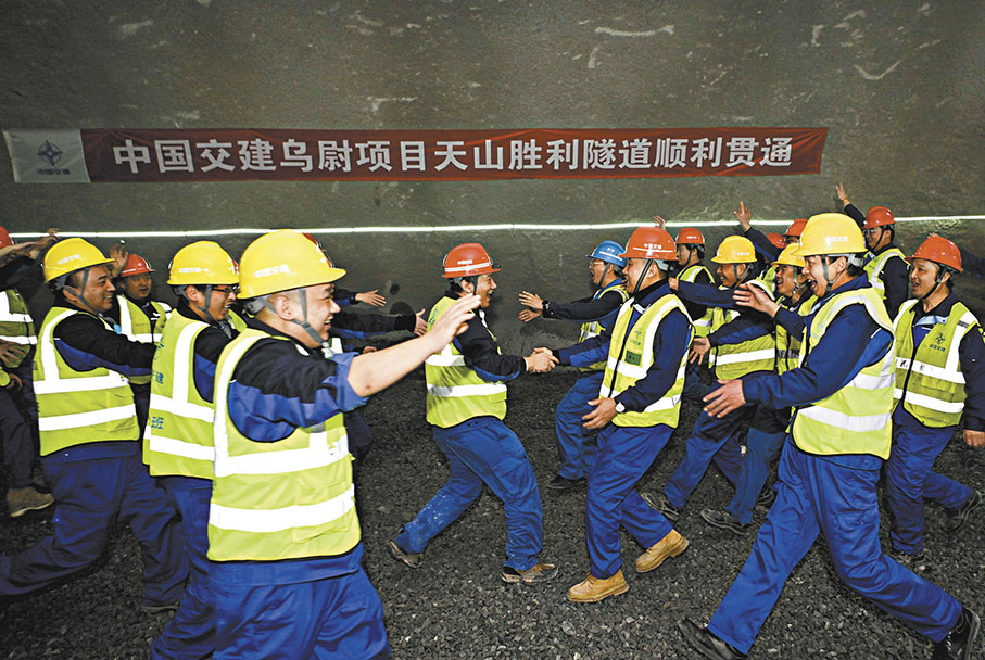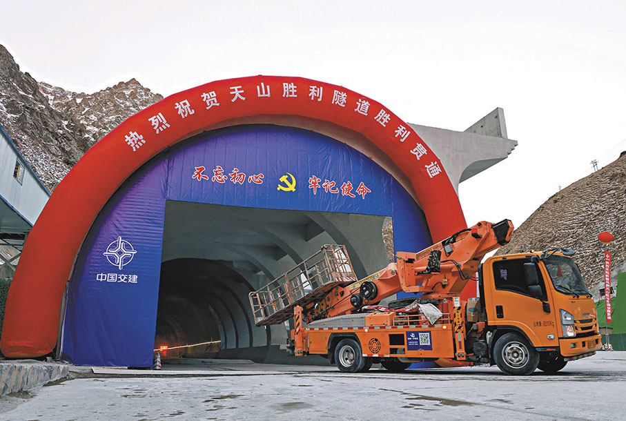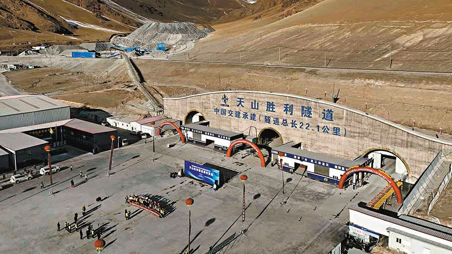天山勝利隧道是國內在建高速公路中典型的特長、高寒、高海拔公路隧道,所處地域地質條件極其複雜。建設者們首次使用了中國自主研發、專門為天山勝利隧道量身定做的2台硬岩掘進機(TBM),並創新使用全球首創的新型壓注式工法及配套TBM裝備施工,打破了國外同領域技術和設備壟斷。同時,左、中、右三個洞口同時掘進,左右兩個為直徑達14米的雙車道主隧道,中間的中導洞(服務隧道)直徑8.4米,採用TBM領先掘進施工,為左右雙主洞開闢輔助工作面,將整條隧道「切割」,實現「長隧超短打」。工期由常規「兩端掘進」施工的10年縮短至4年多,填補了國內隧道施工技術的空白。