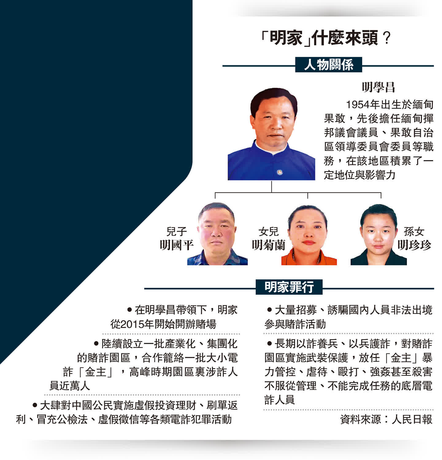 「10·20」案件,只是明家犯罪集團罪惡行徑的冰山一角。2015年以來,在明學昌帶領下,明家犯罪集團通過招攬「金主」陸續設立「卧虎山莊」「玉祥國際集團」等「產業化」「集團化」的賭詐園區,大肆實施針對中國公民的電信網絡詐騙和跨境賭博等犯罪活動。