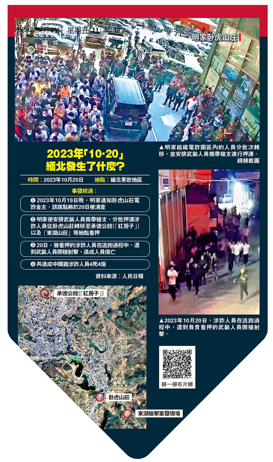 大公報綜合新華社、央視新聞、中國警察網報道:「嘭……嘭嘭……」槍聲劃破夜幕,人群四散奔逃。2023年10月20日,緬甸果敢老街,兩處集中看押中國涉詐人員的電詐園區先後傳來密集槍聲。在警方後來取證的視頻畫面中,有人中槍倒下,有人背着受傷同伴逃命。這兩處園區均為緬北果敢明學昌「明氏家族」旗下產業。槍擊事件過後,相關視頻在網上廣泛傳播,「『10·20』案件造成上百人傷亡」「4名中國警察在電詐園區被殘忍殺害」……一時間,謠言四起。