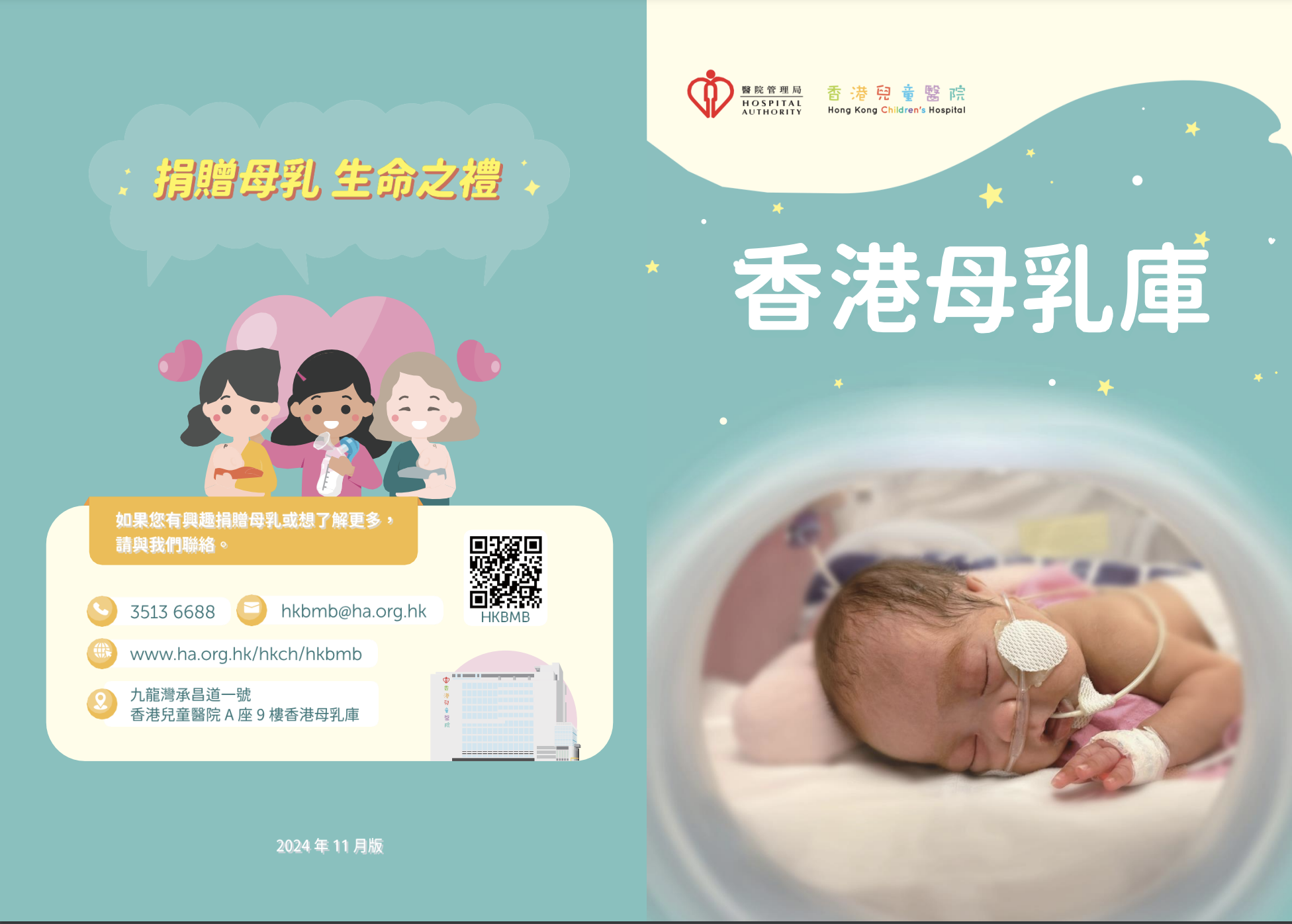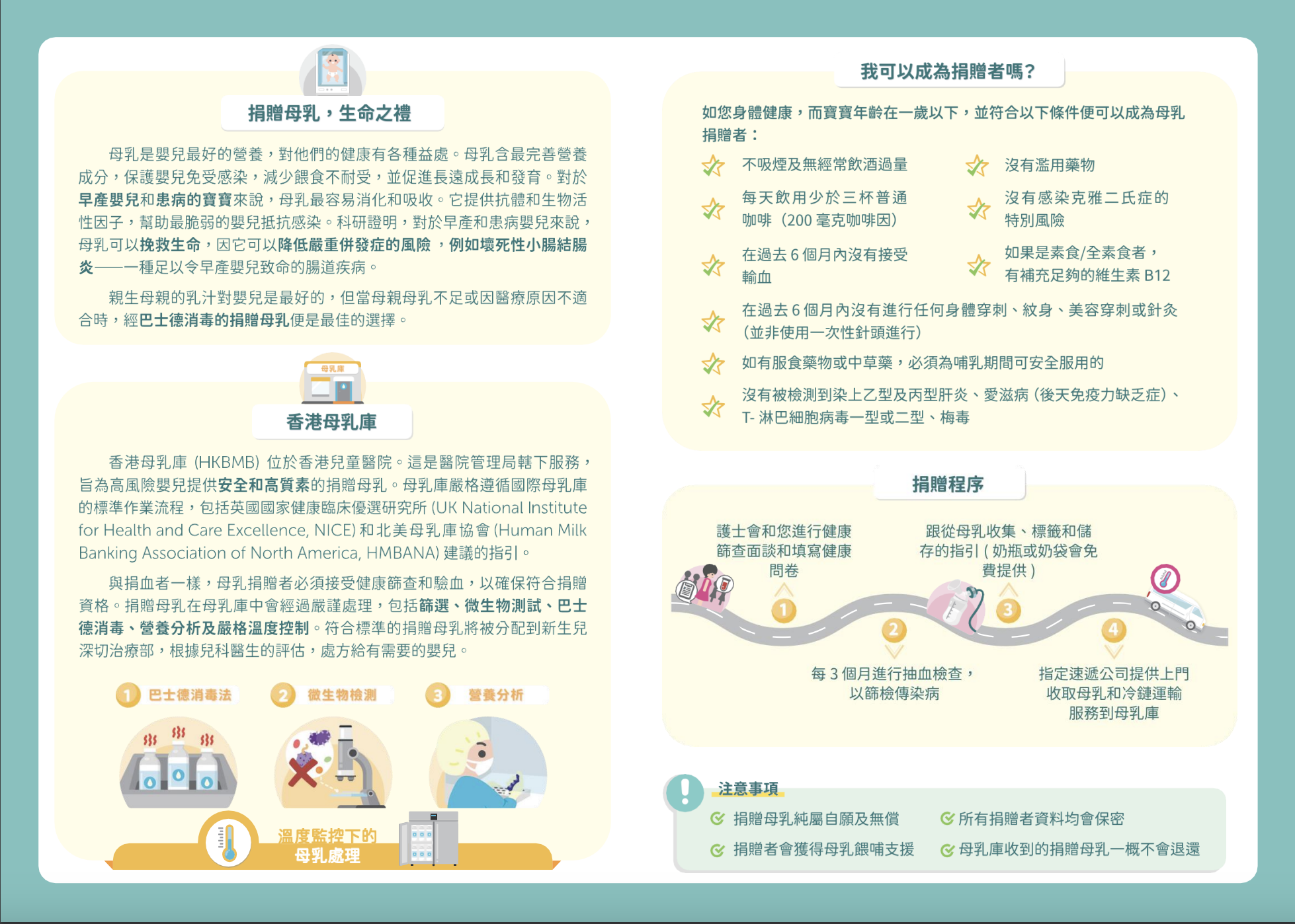 黃醫生補充,母乳有助早產和患病嬰兒預防感染,減少餵食不耐症及足以致命的併發症,如壞死性小腸結腸炎,並促進其長遠成長和發育。母乳捐贈者必須正在授乳,而其嬰兒年齡須在1歲以下。有意成為捐贈者的母親可透過以下途徑登記: