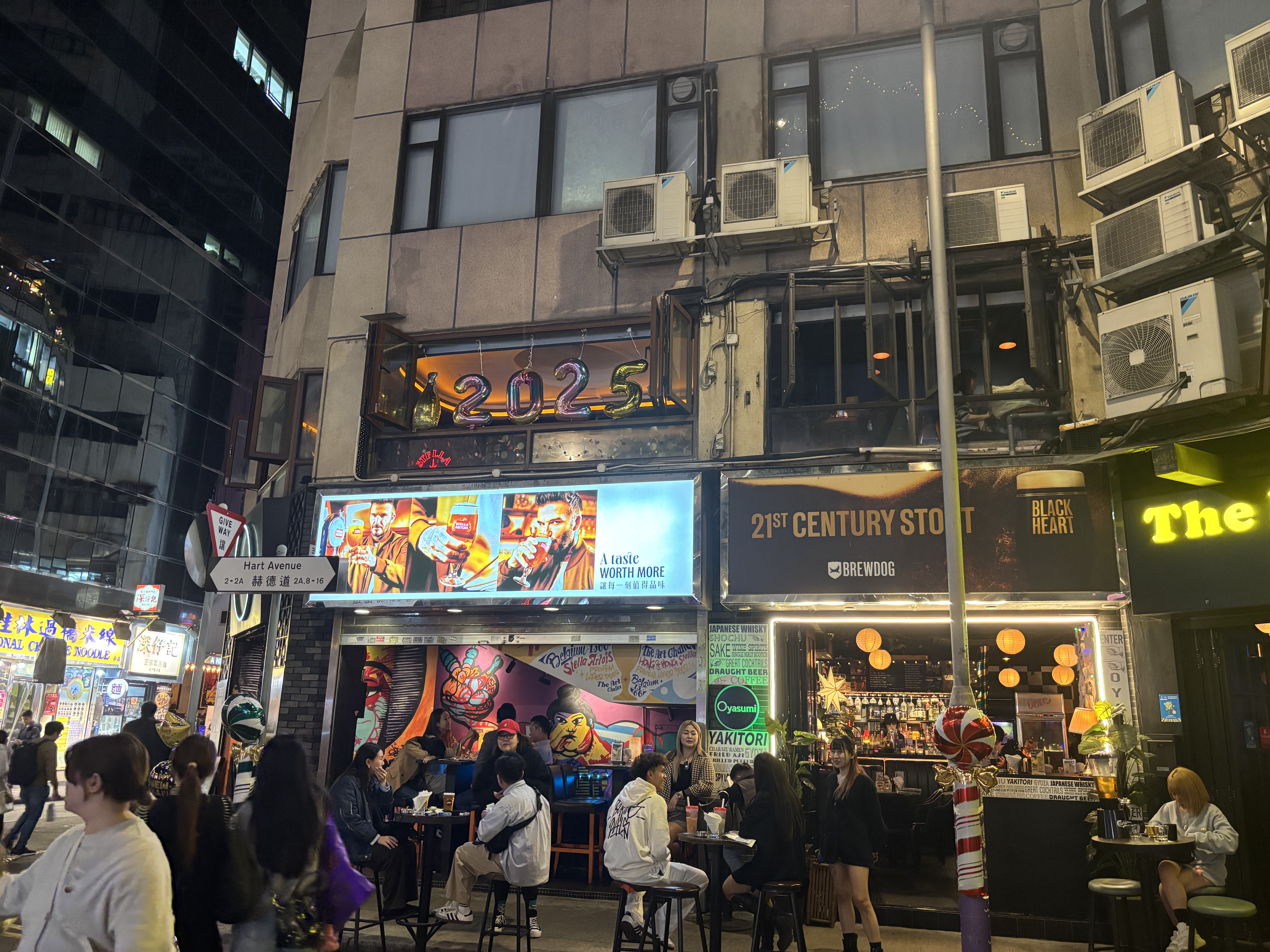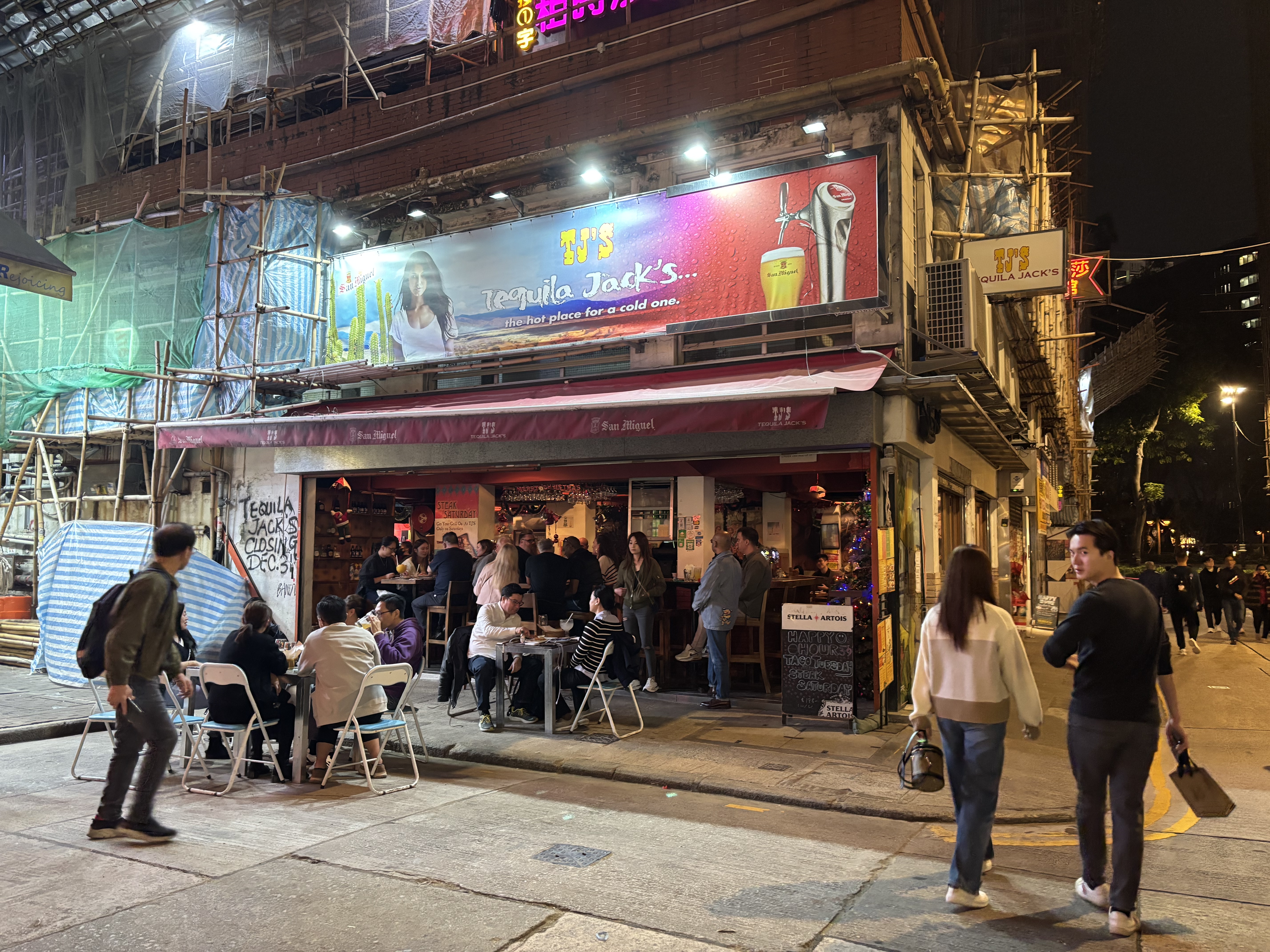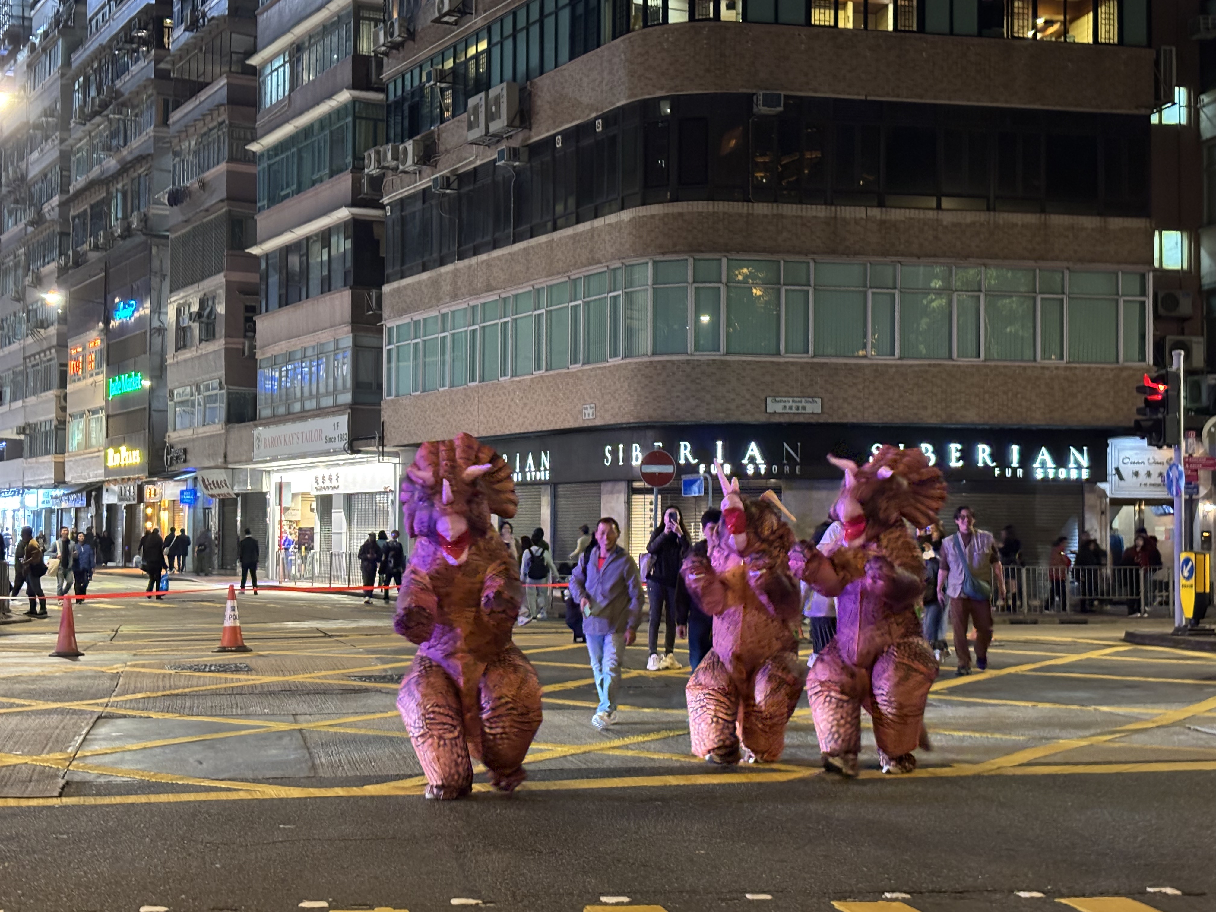 在尖沙咀街頭,晚飯時間餐廳酒吧已經人流湧動,市民相約親朋好友,高舉酒杯,一起高呼慶祝;亦有市民與朋友一同身着恐龍服飾,用特殊的方式迎接新一年。