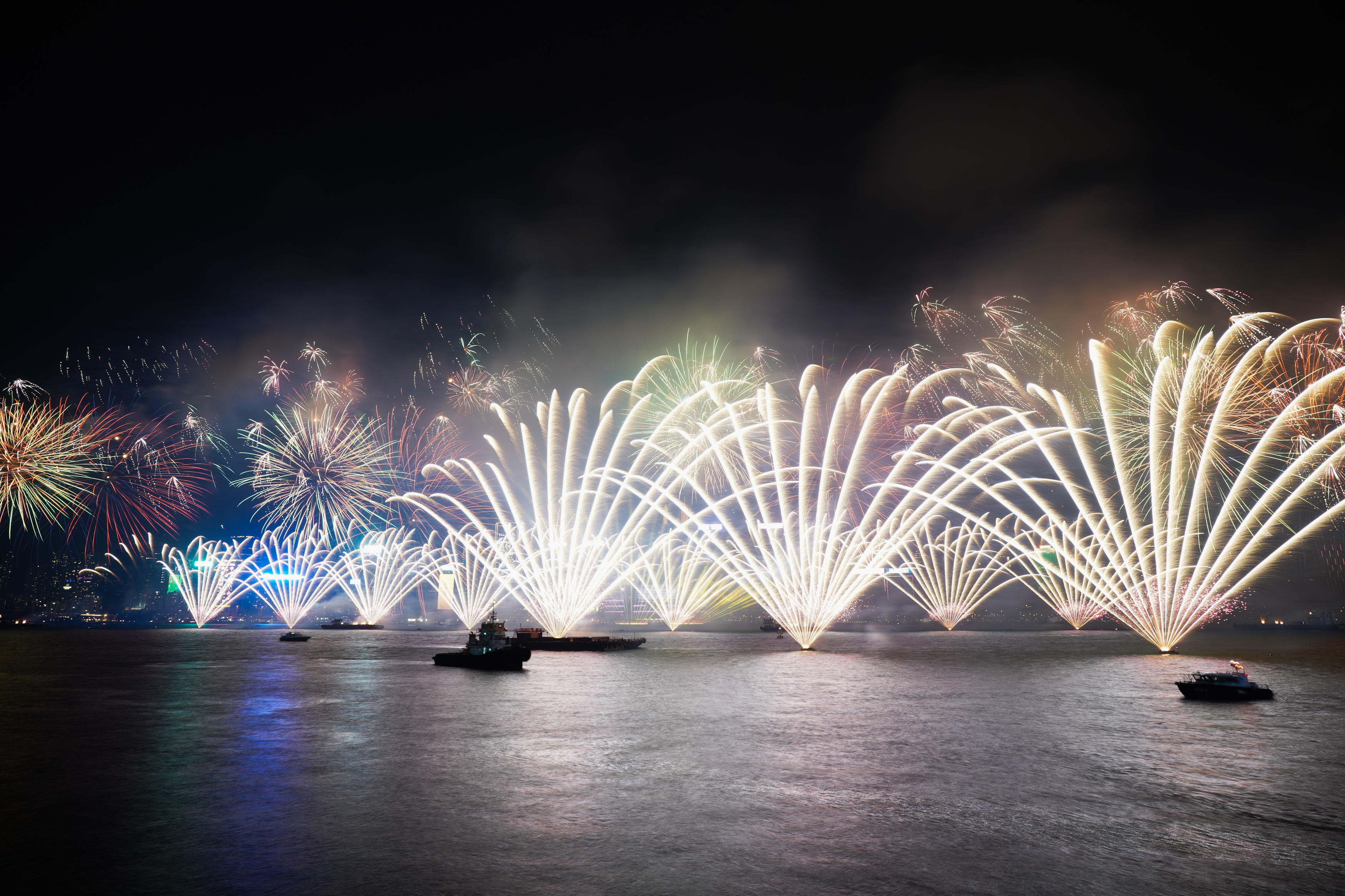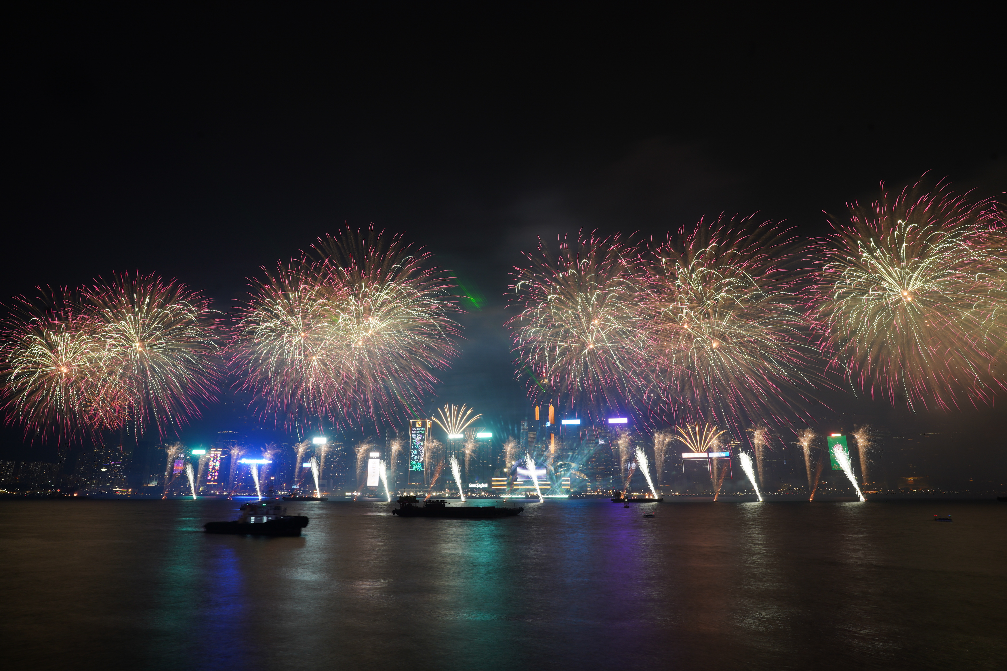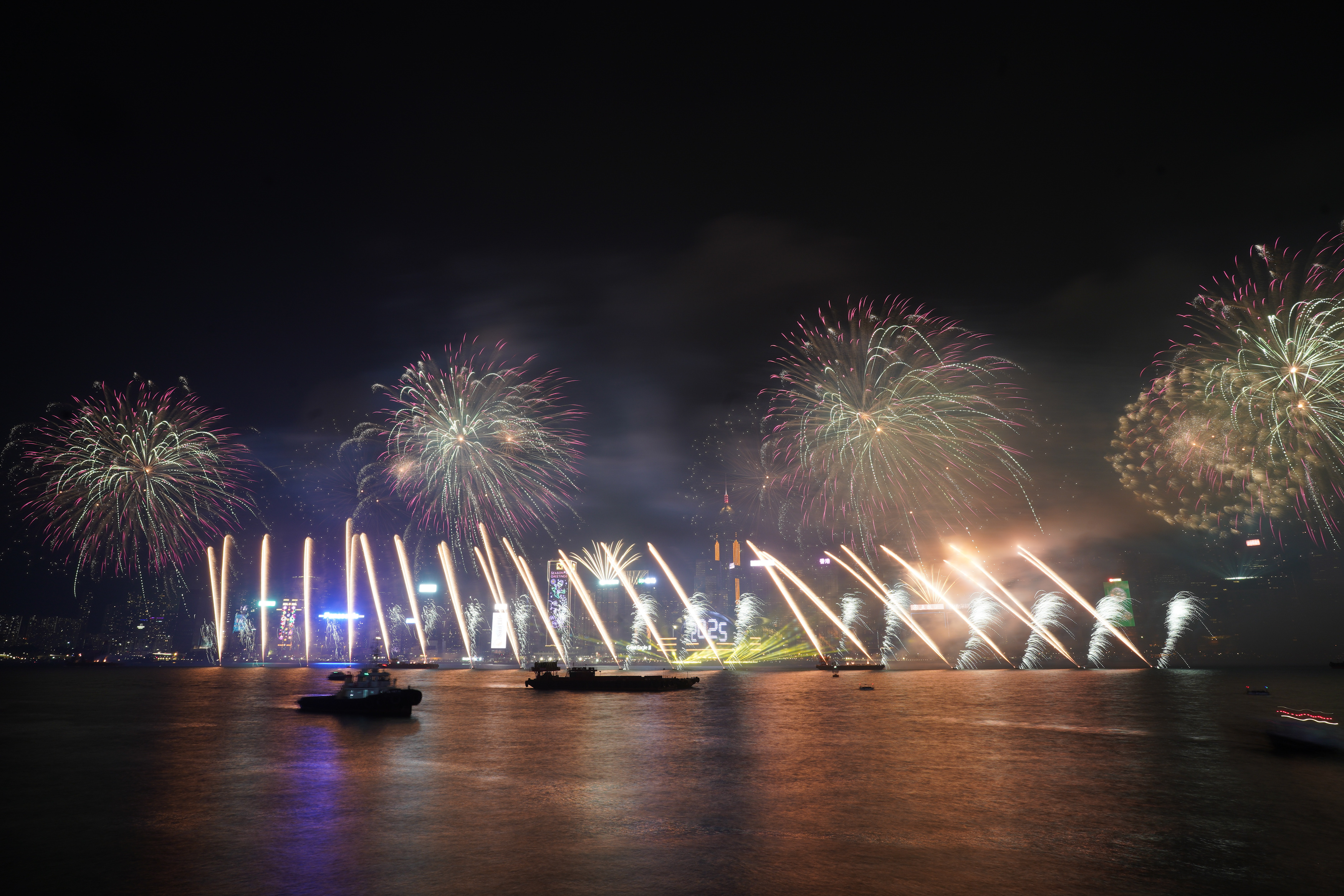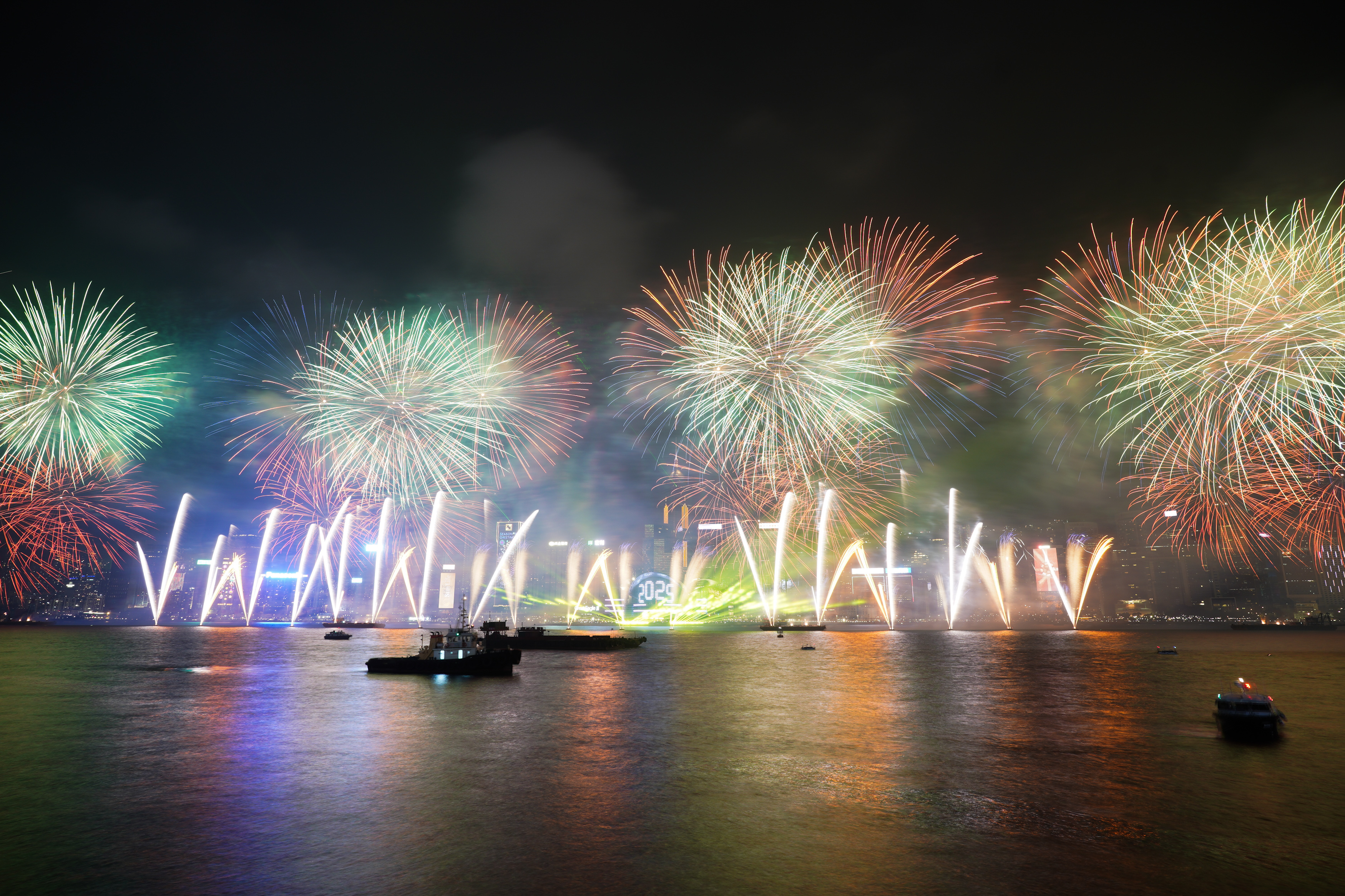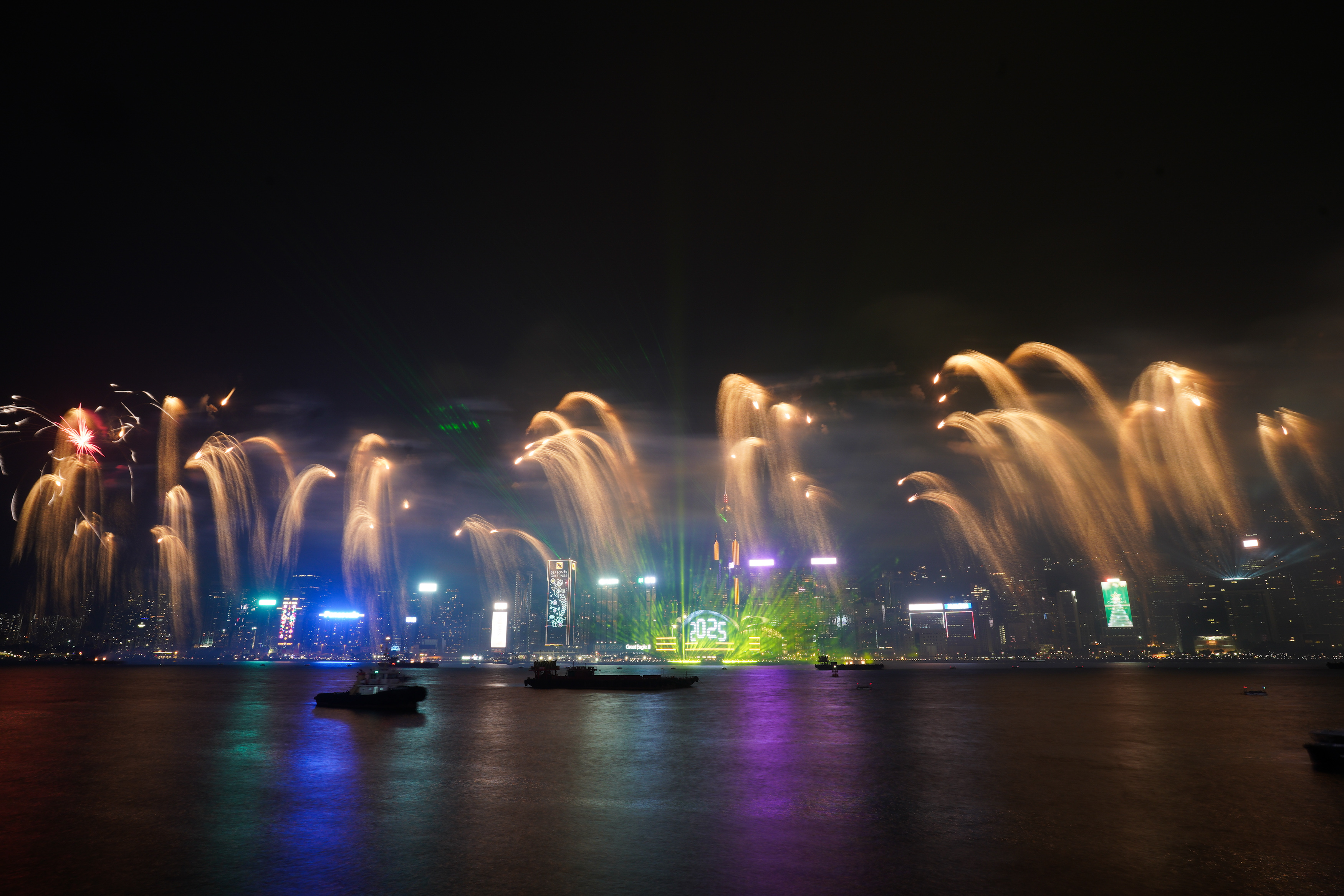 接近午夜時分,在眾人「5、4、3、2、1」齊齊的倒數聲中,海上躉船紛紛傳出陣陣炮聲,伴隨「Happy New Year」的歡呼聲,七彩繽紛的煙花迅即在中環至北角一帶的維港夜空中綻放,為新一年揭開序幕。