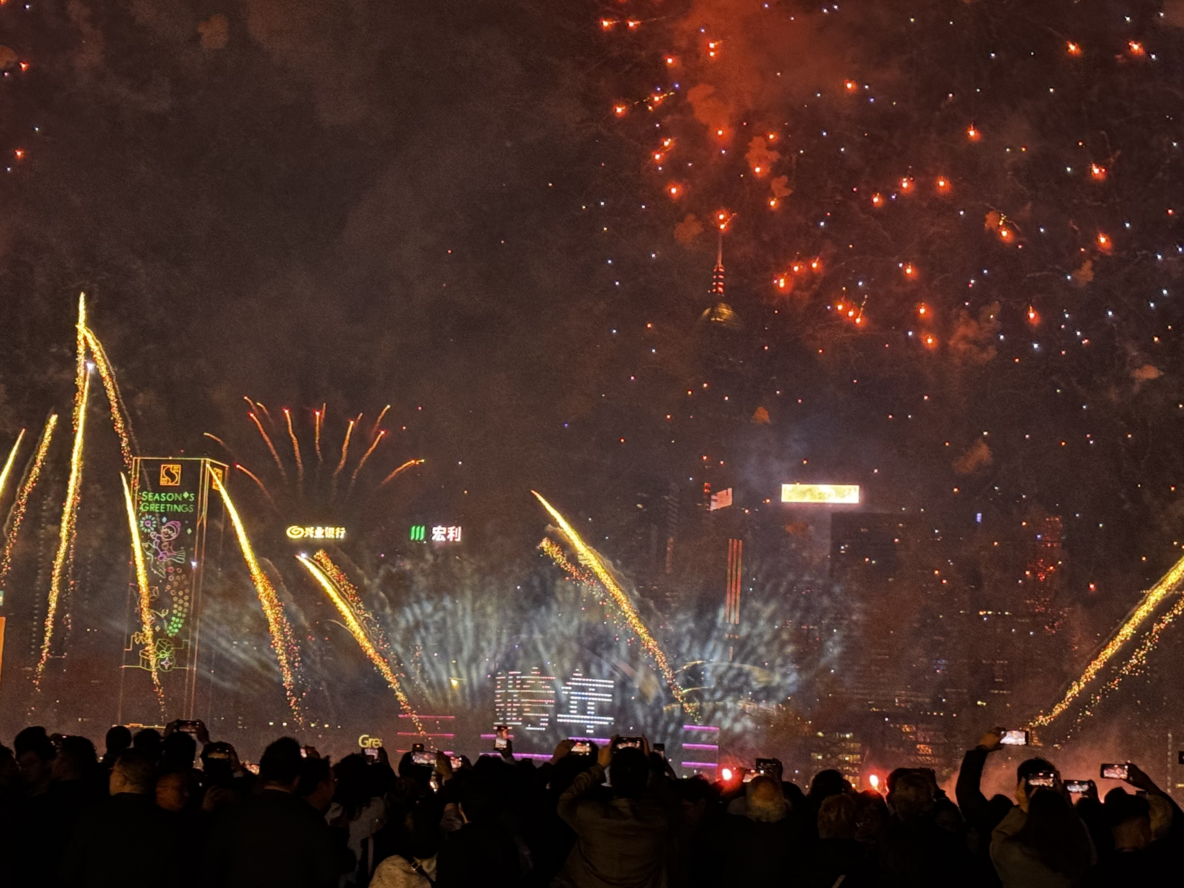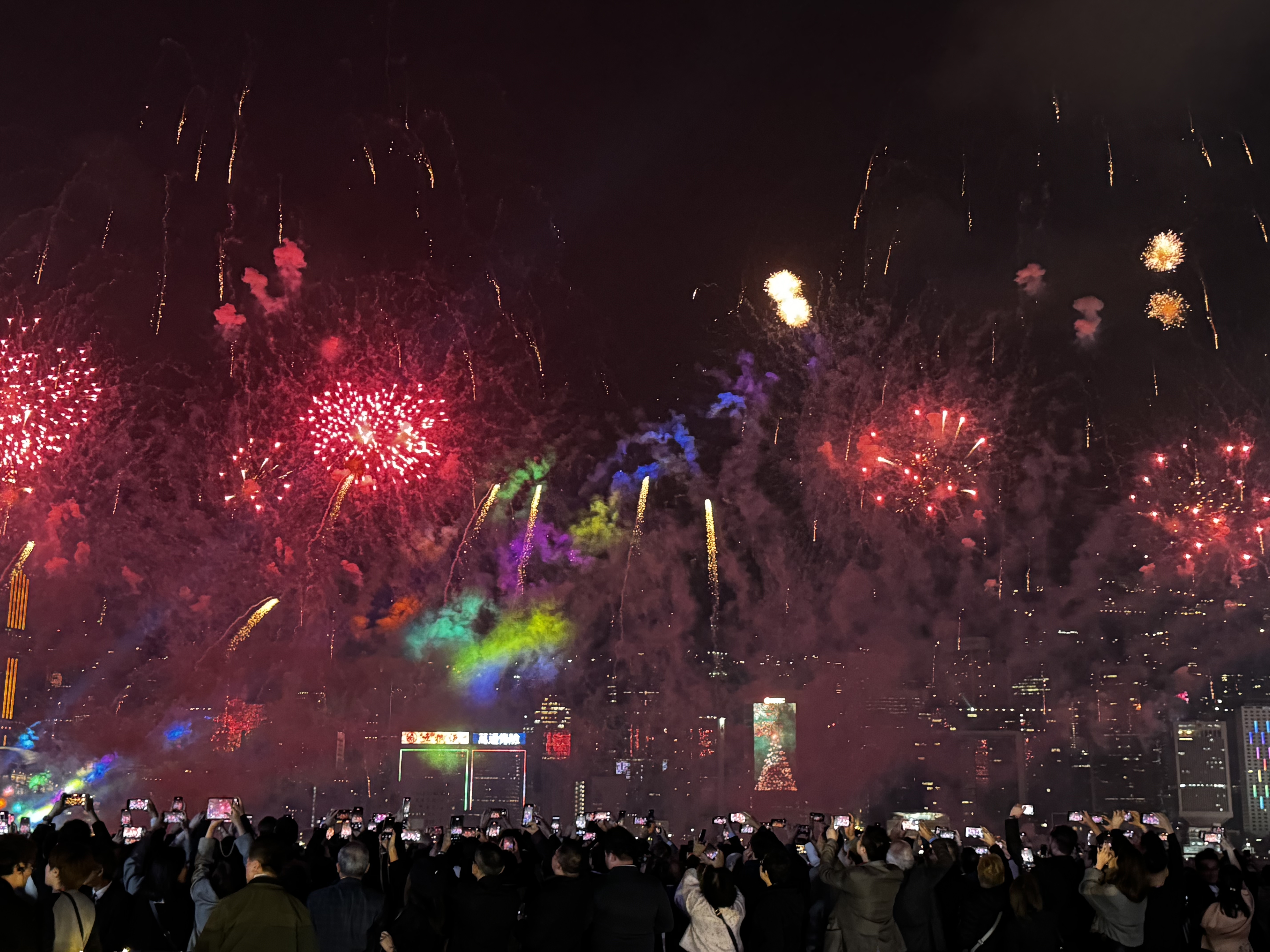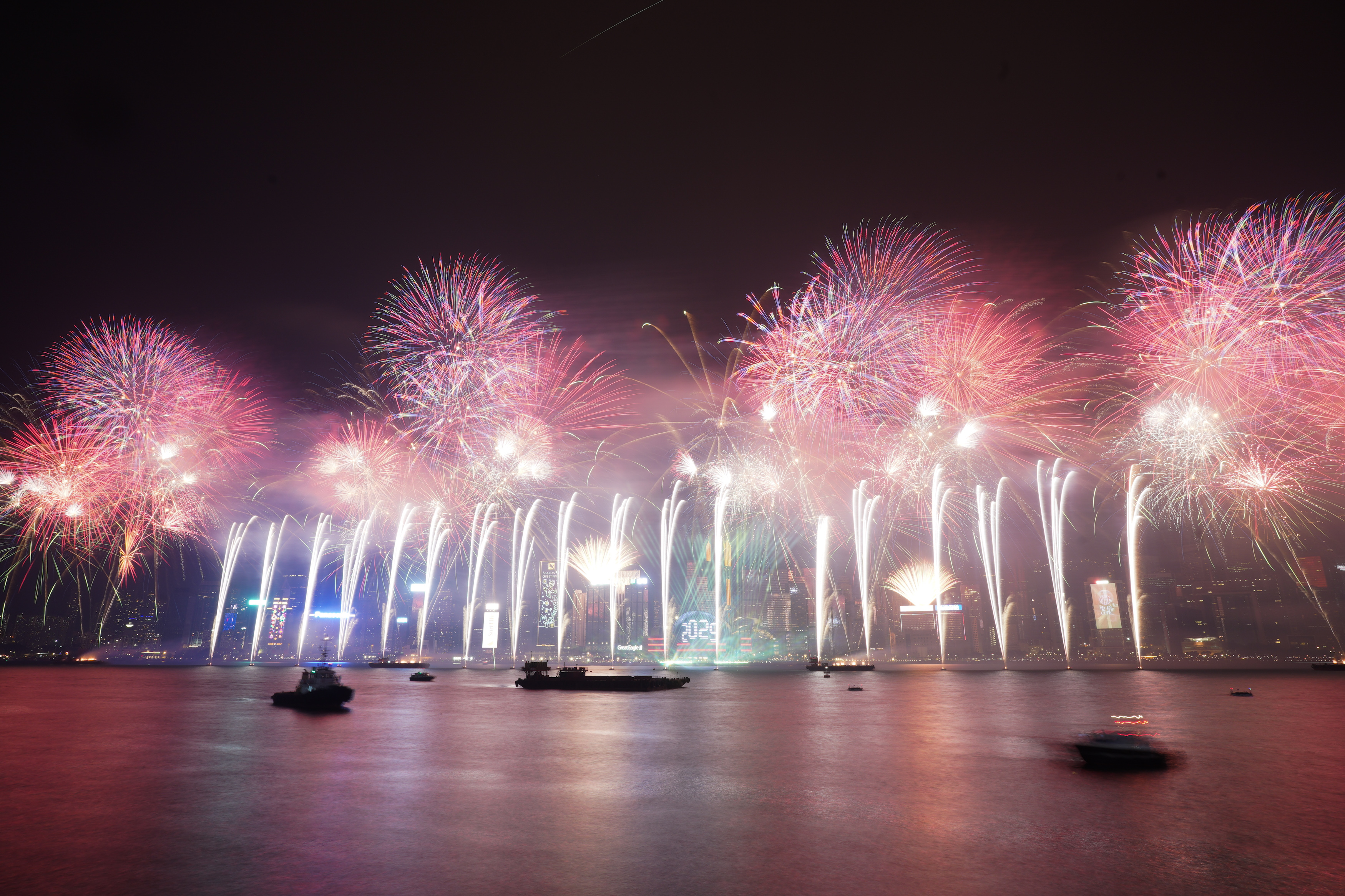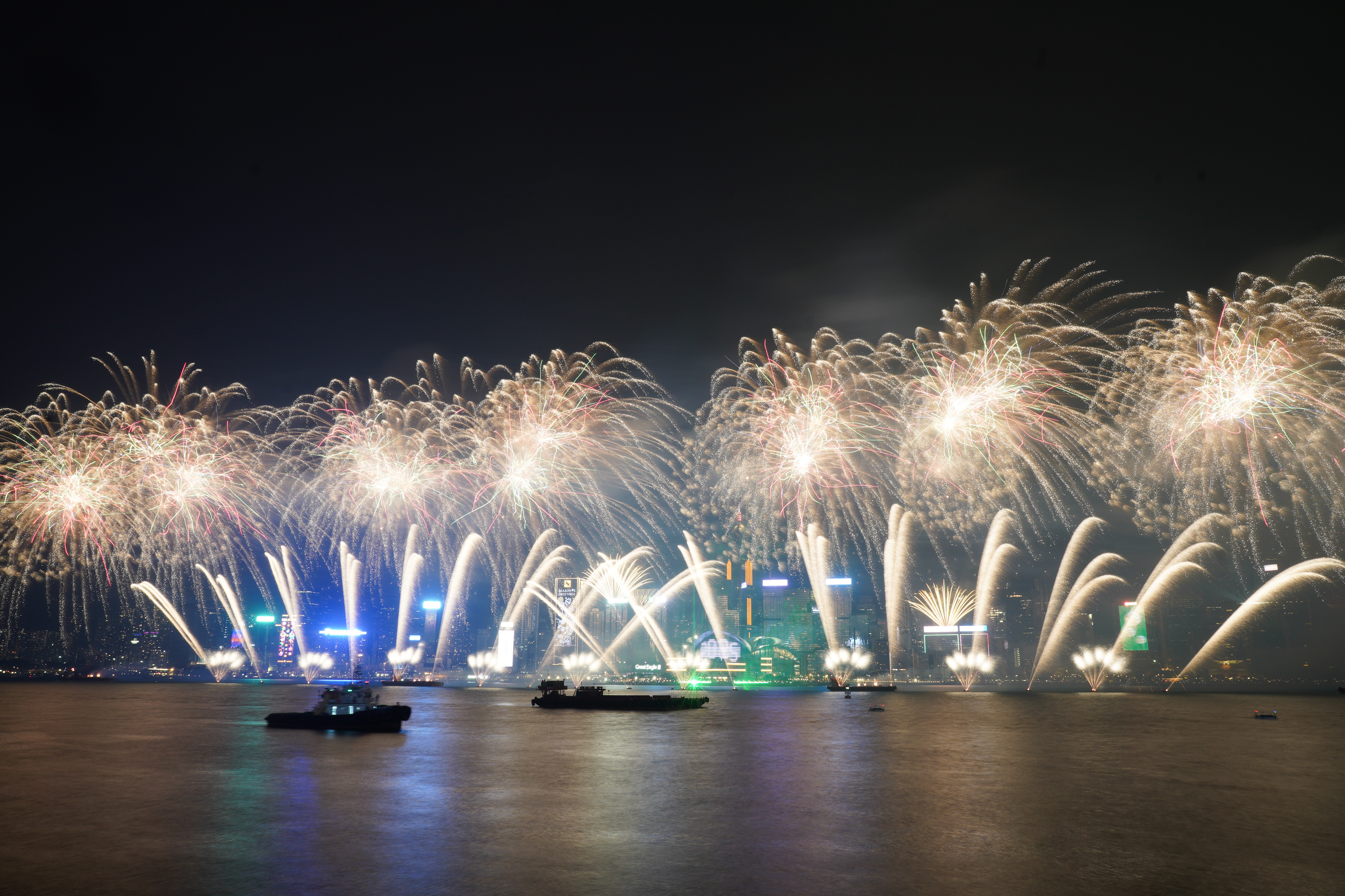 接近午夜時分,在眾人「5、4、3、2、1」齊齊的倒數聲中,海上躉船紛紛傳出陣陣炮聲,伴隨「Happy New Year」的歡呼聲,七彩繽紛的煙花迅即在中環至北角一帶的維港夜空中綻放,為新一年揭開序幕。