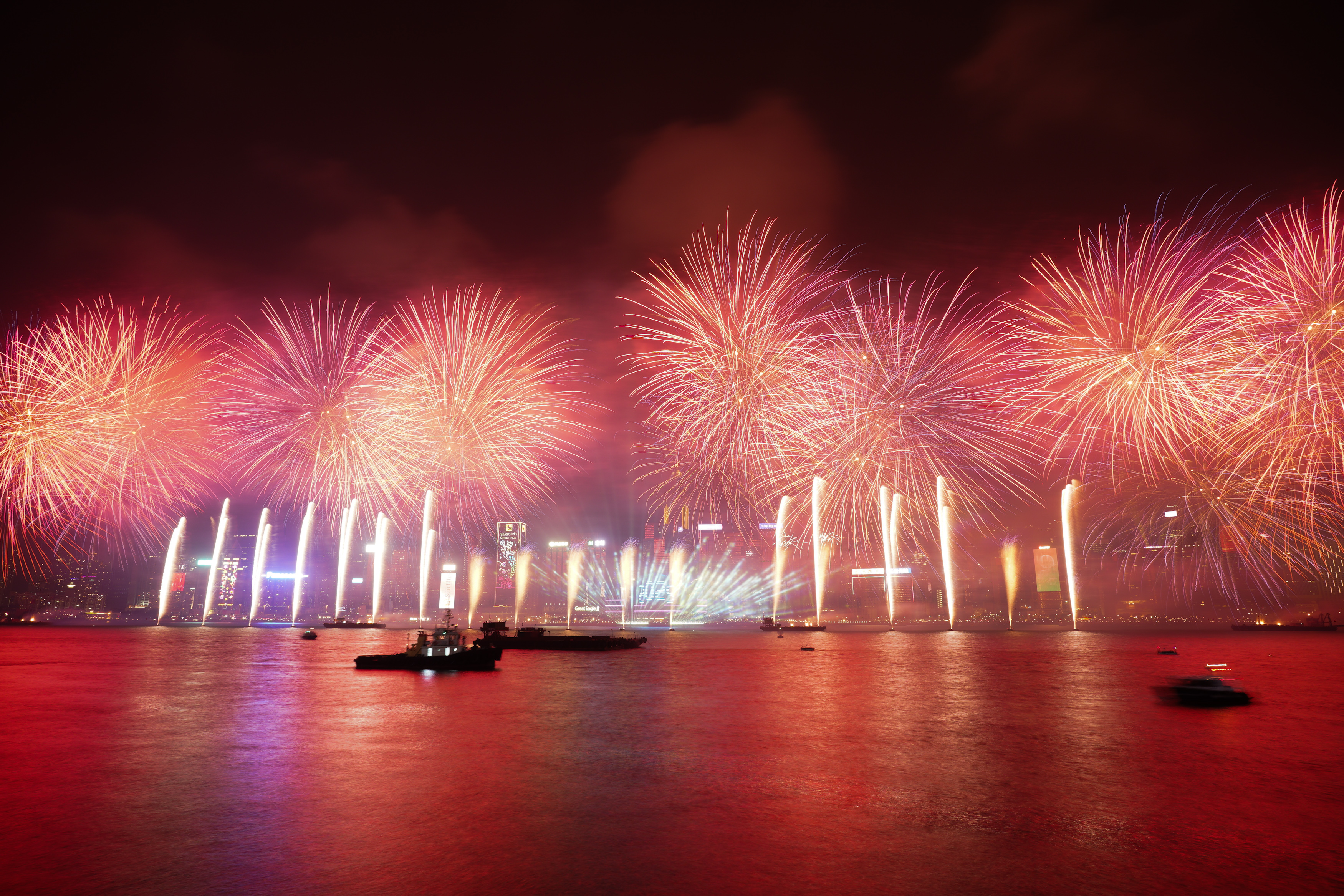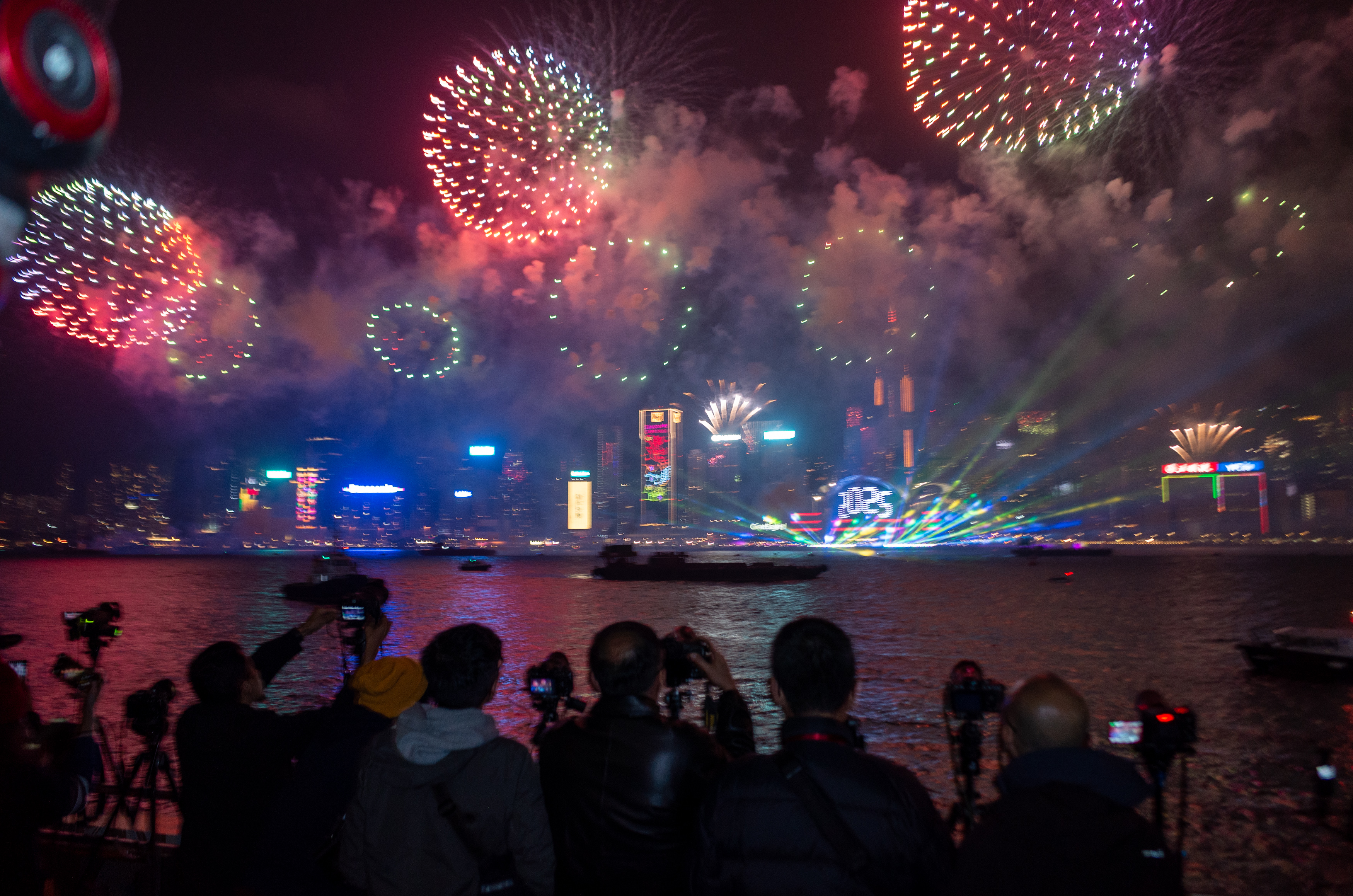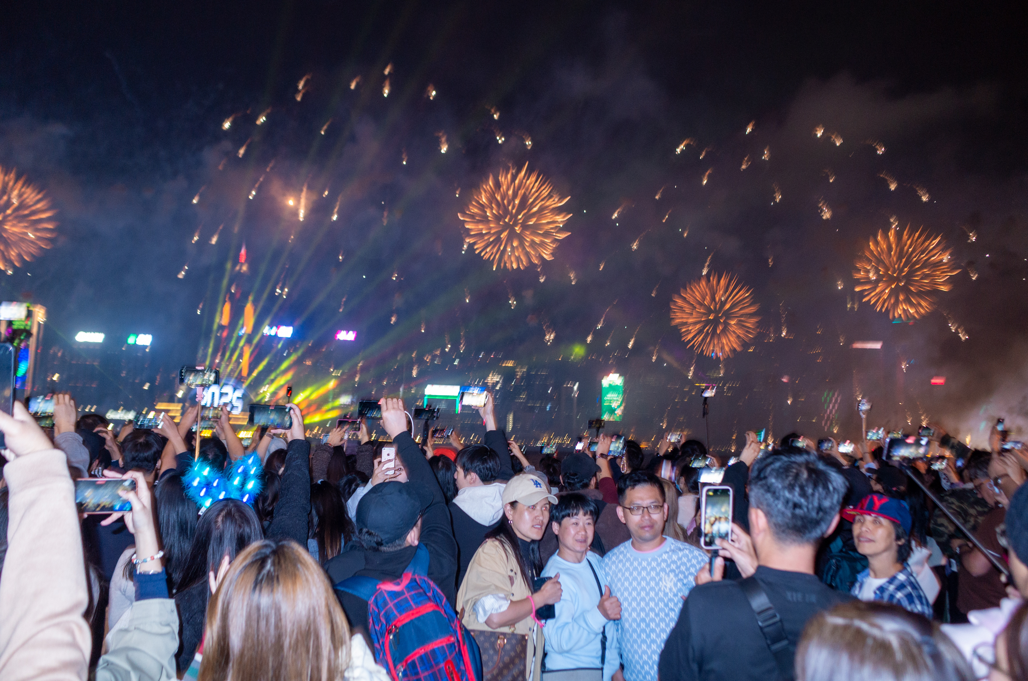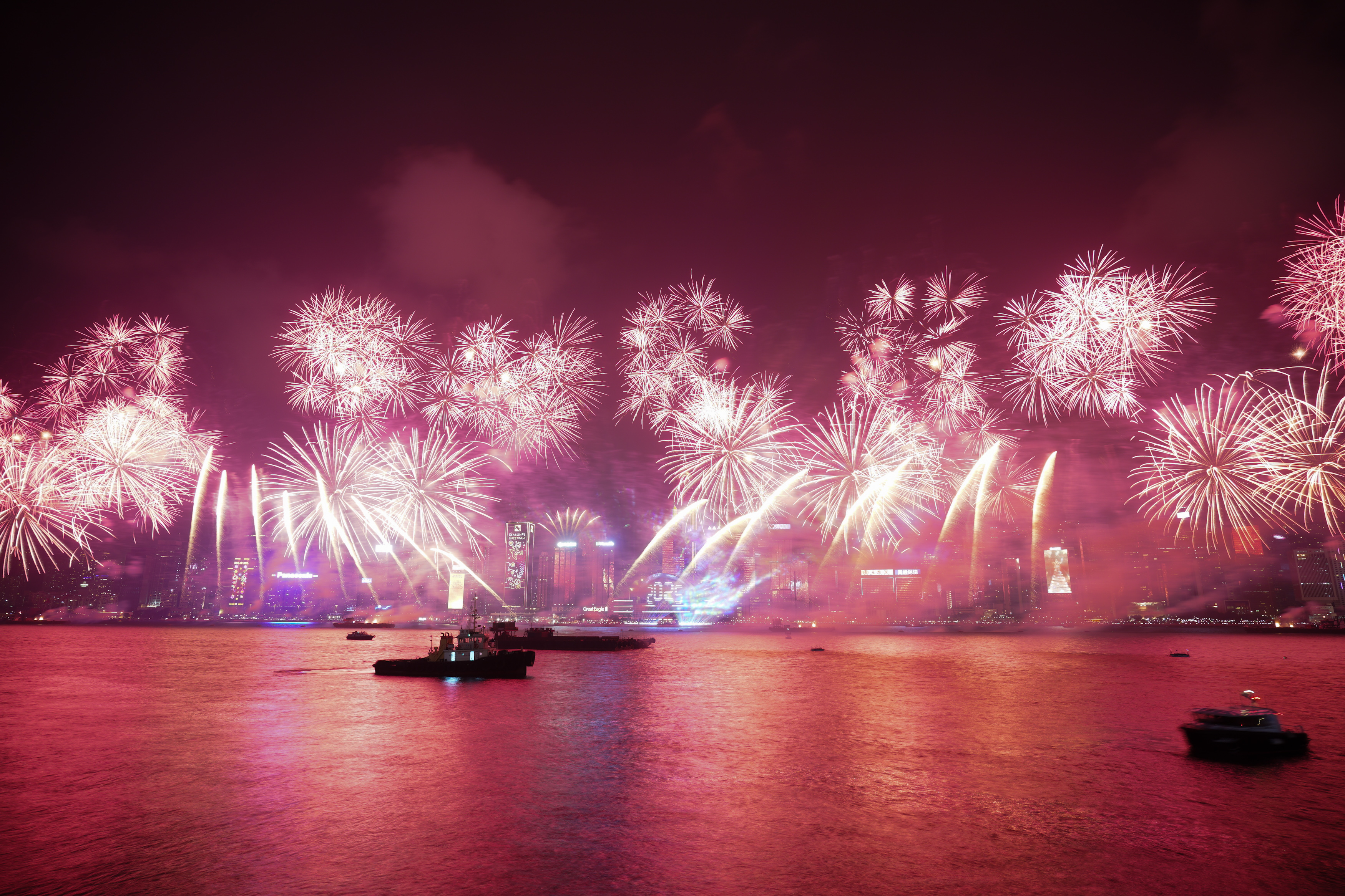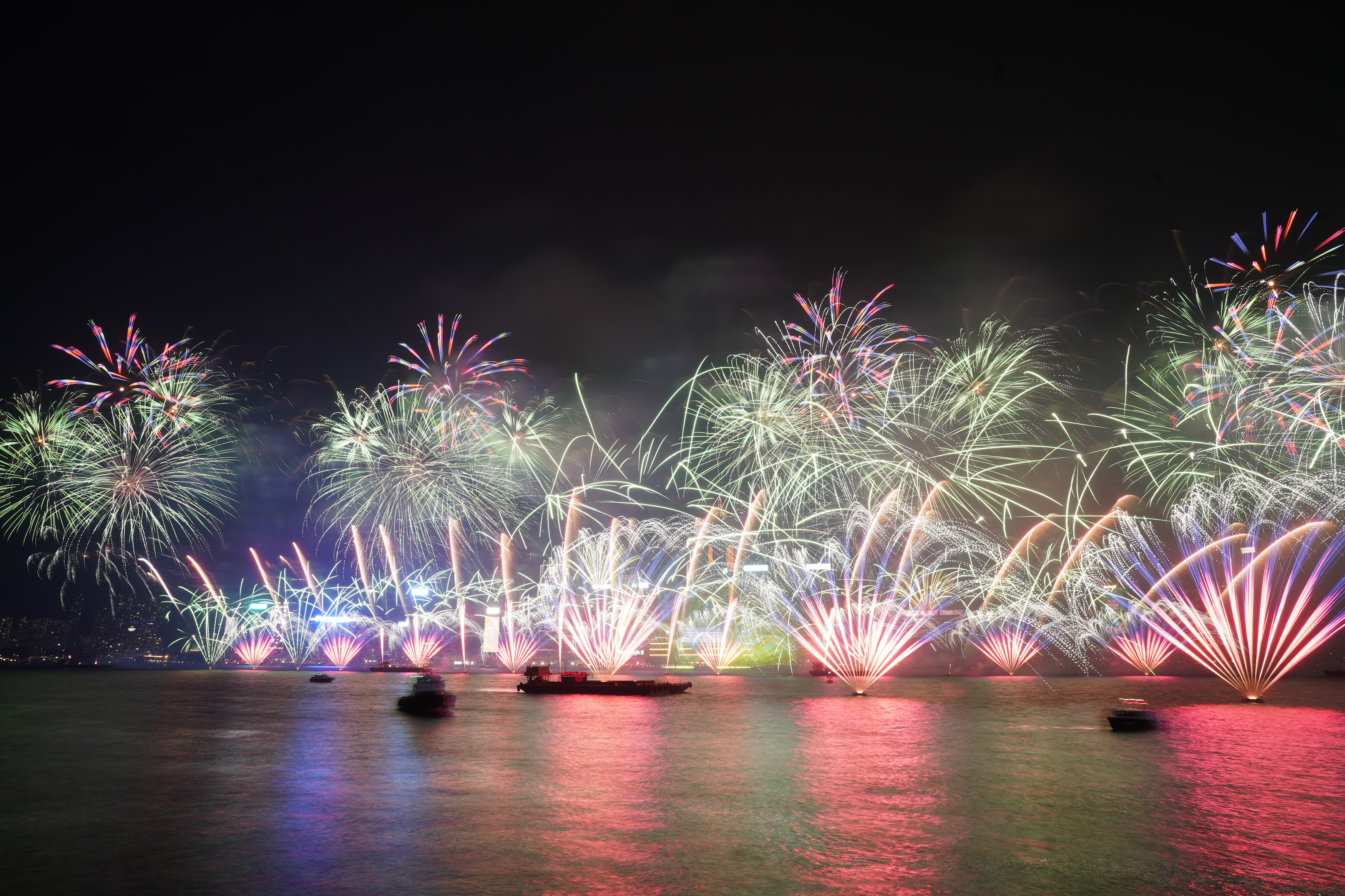 接近午夜時分,在眾人「5、4、3、2、1」齊齊的倒數聲中,海上躉船紛紛傳出陣陣炮聲,伴隨「Happy New Year」的歡呼聲,七彩繽紛的煙花迅即在中環至北角一帶的維港夜空中綻放,為新一年揭開序幕。