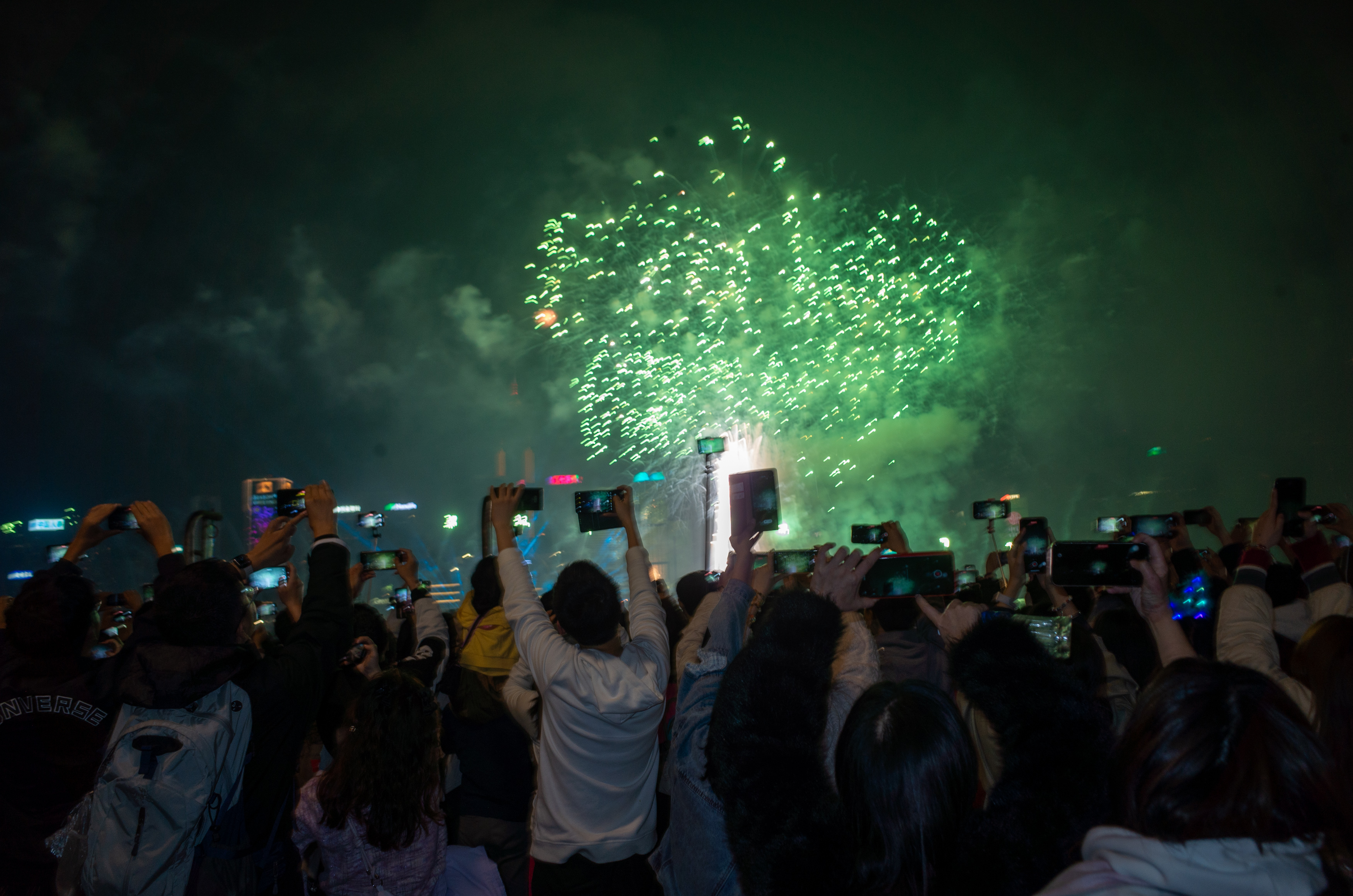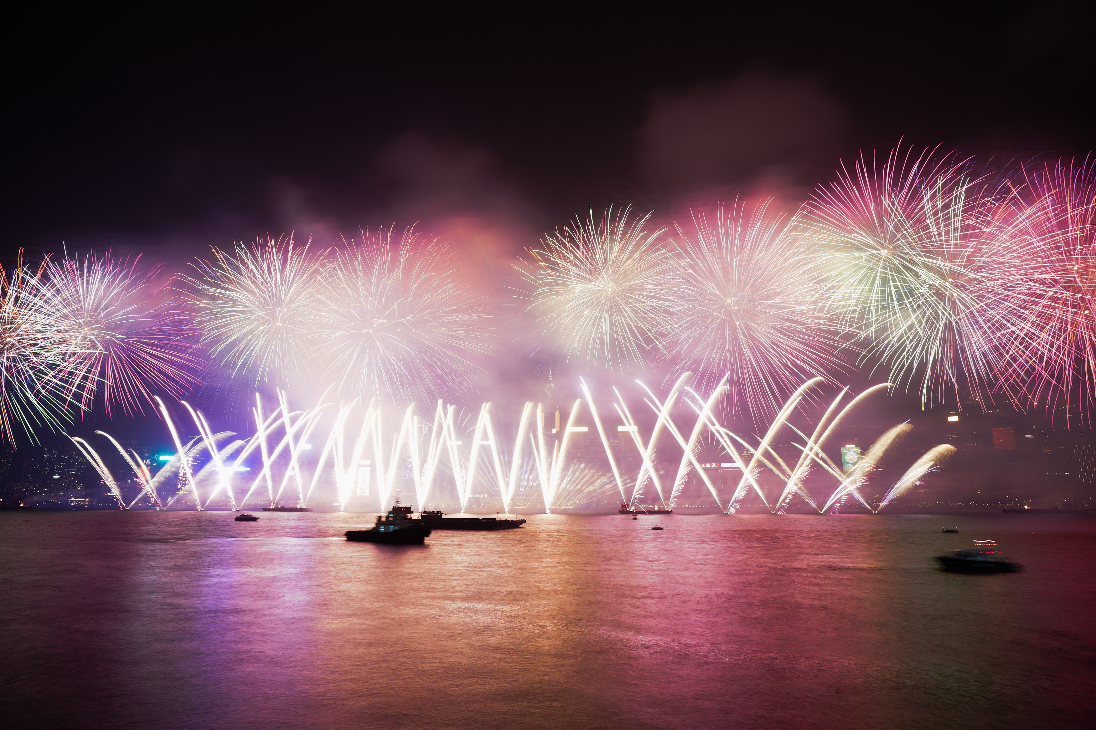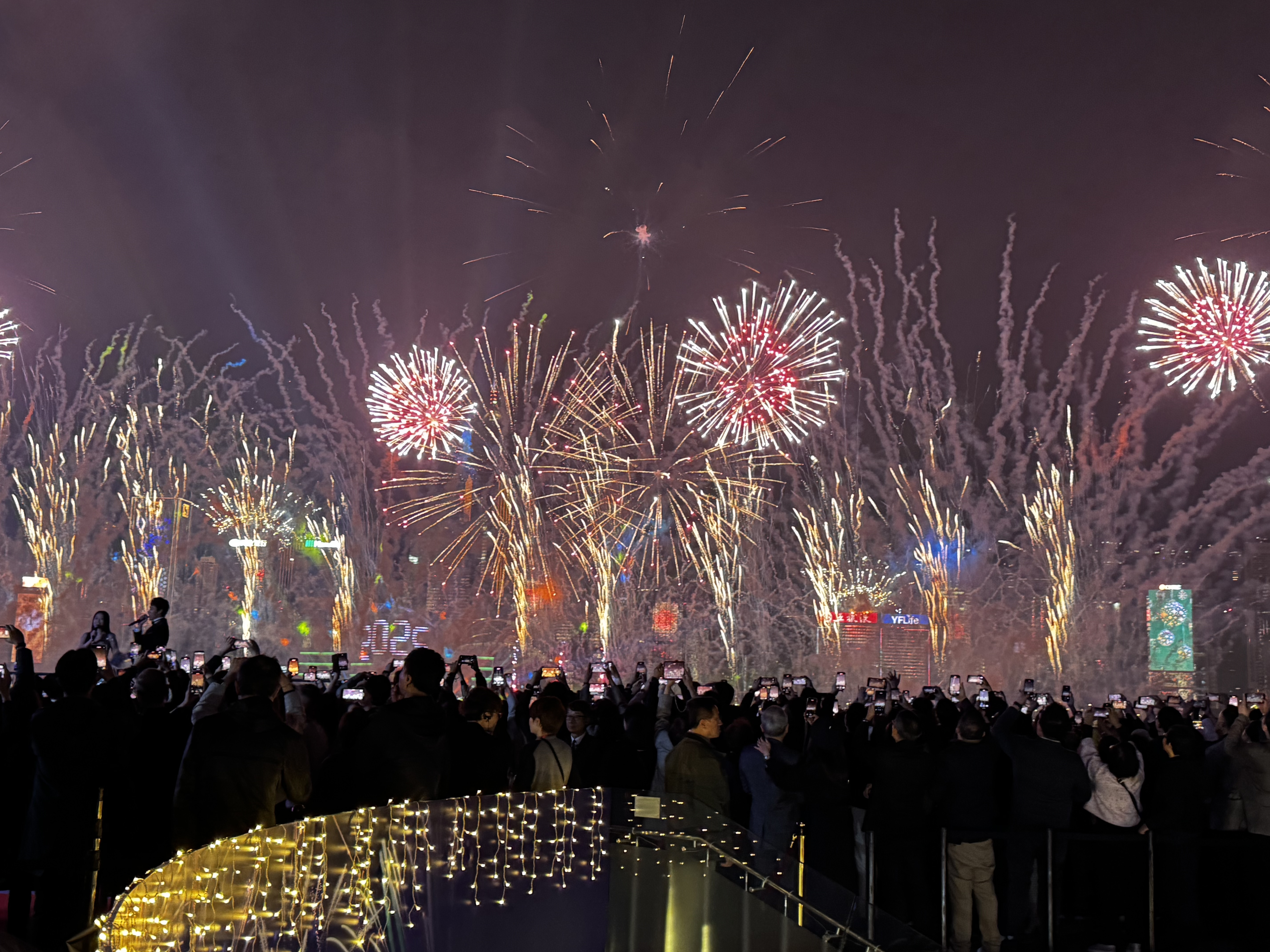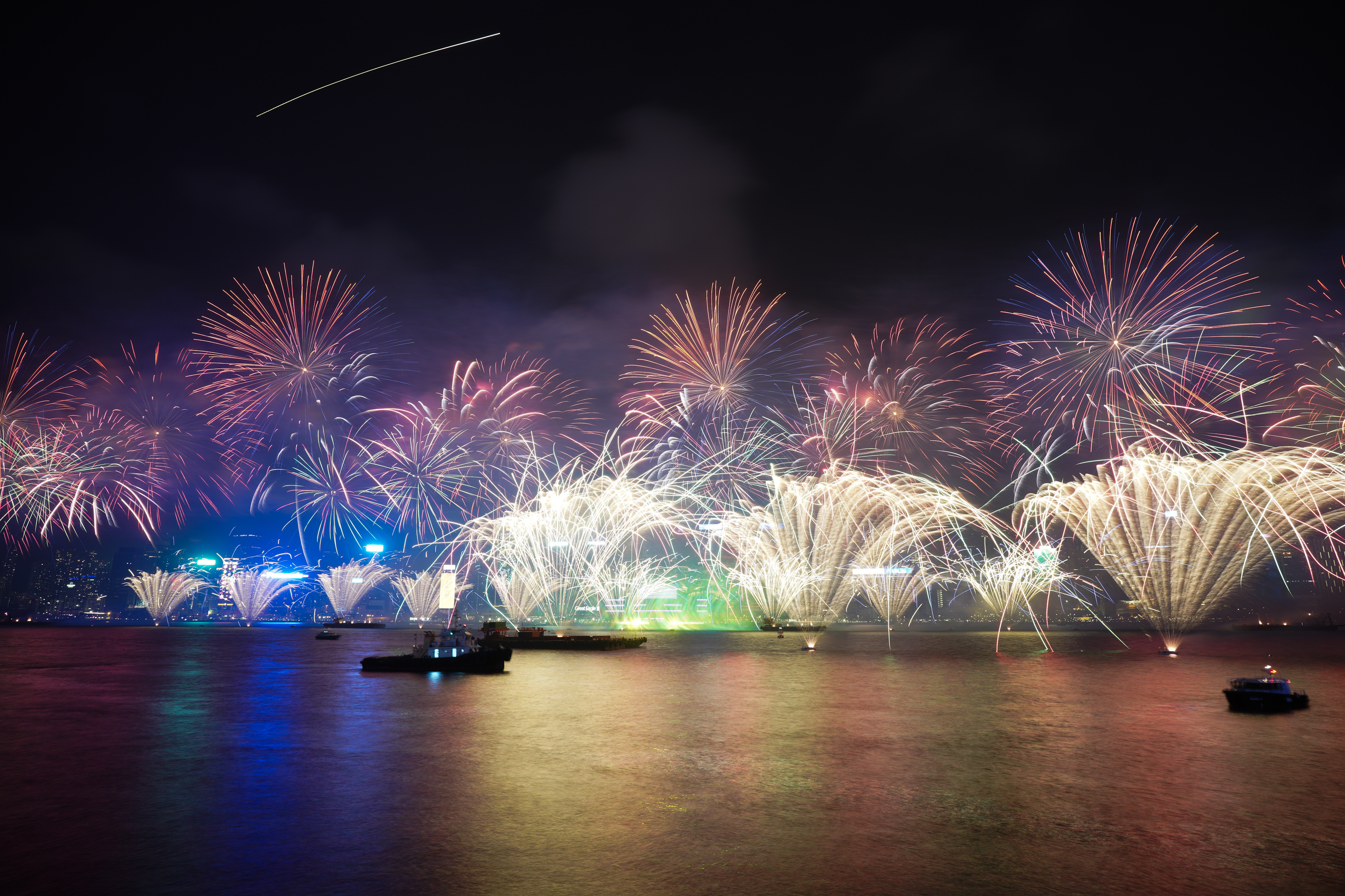 接近午夜時分,在眾人「5、4、3、2、1」齊齊的倒數聲中,海上躉船紛紛傳出陣陣炮聲,伴隨「Happy New Year」的歡呼聲,七彩繽紛的煙花迅即在中環至北角一帶的維港夜空中綻放,為新一年揭開序幕。