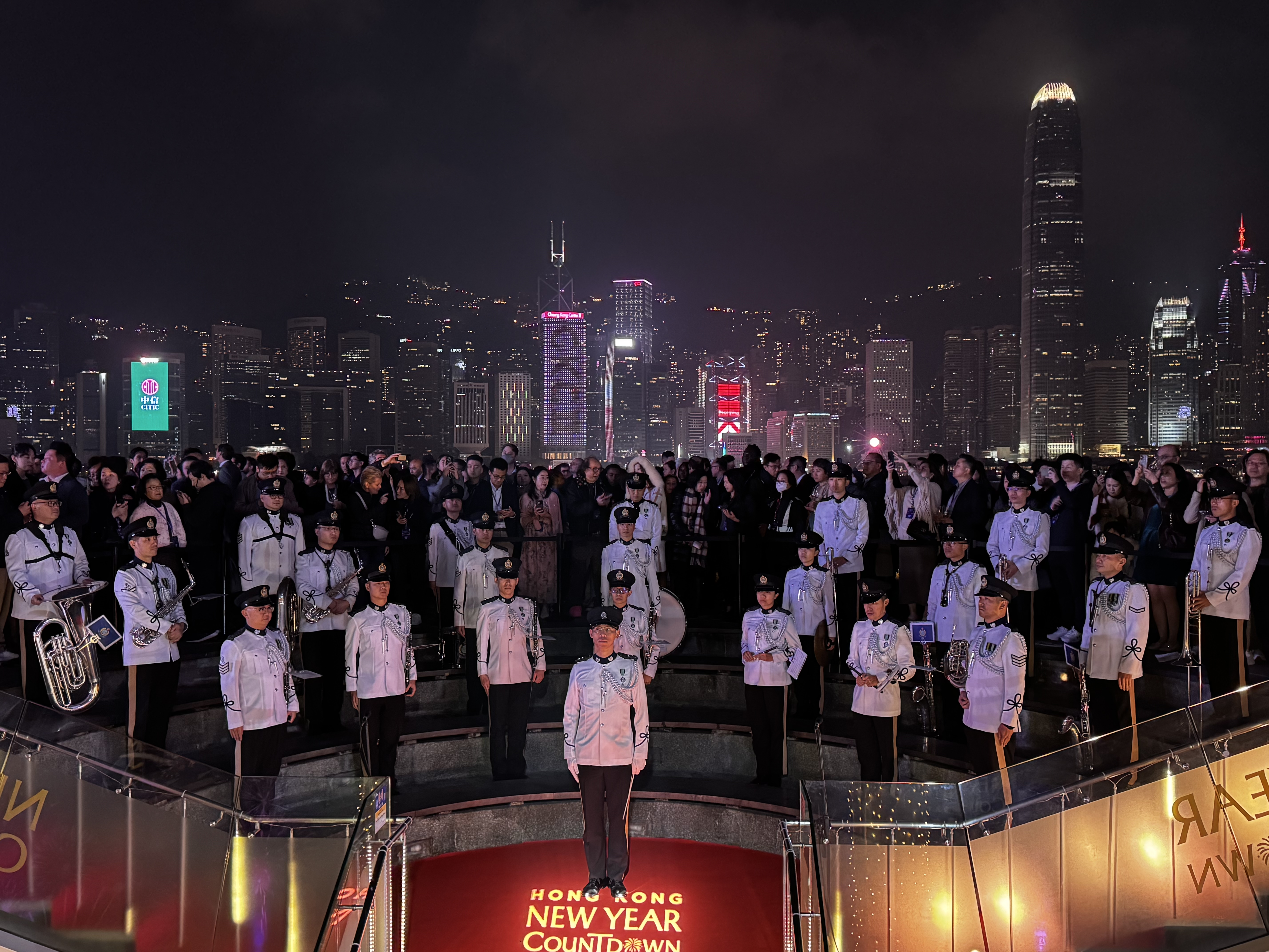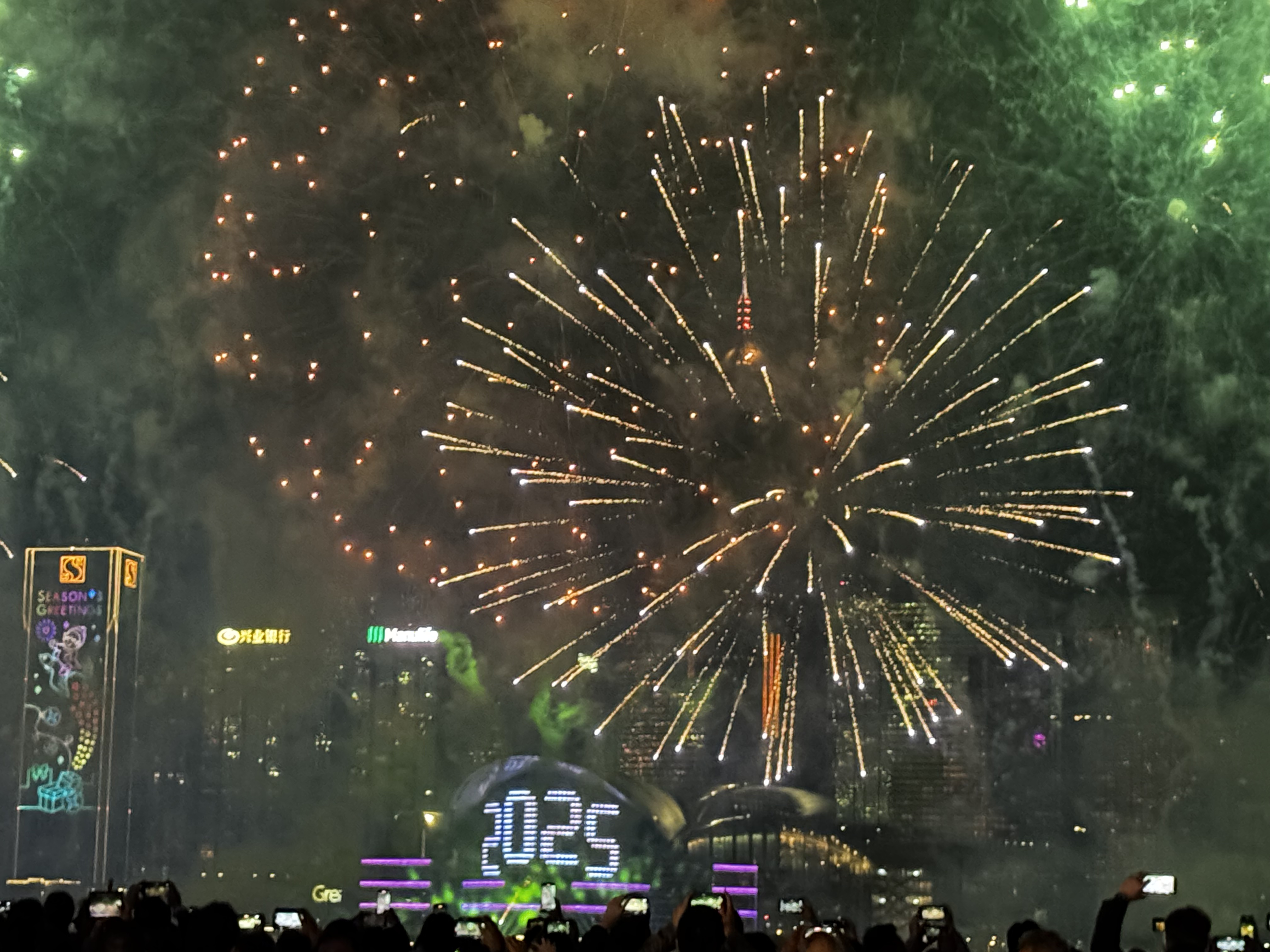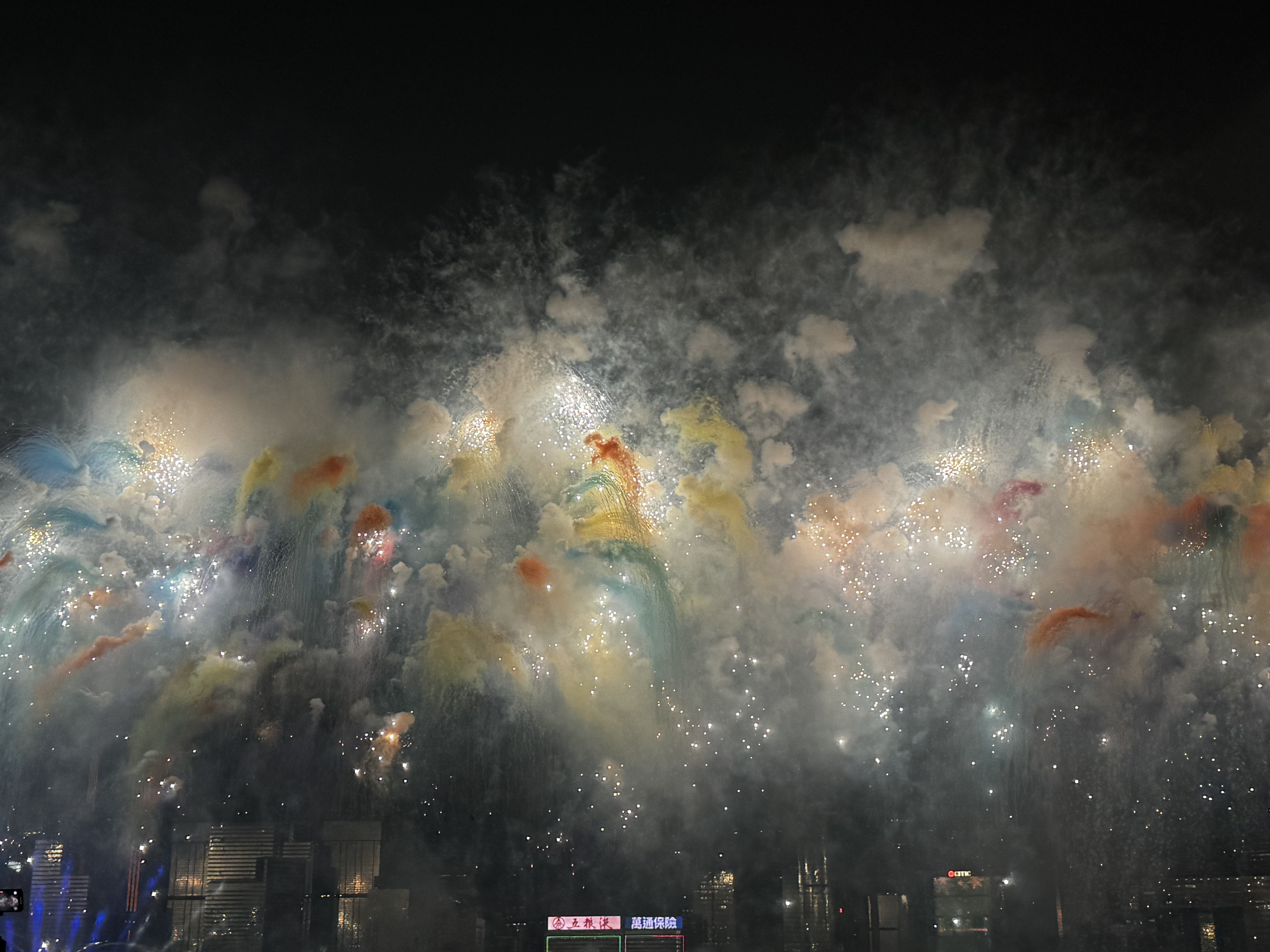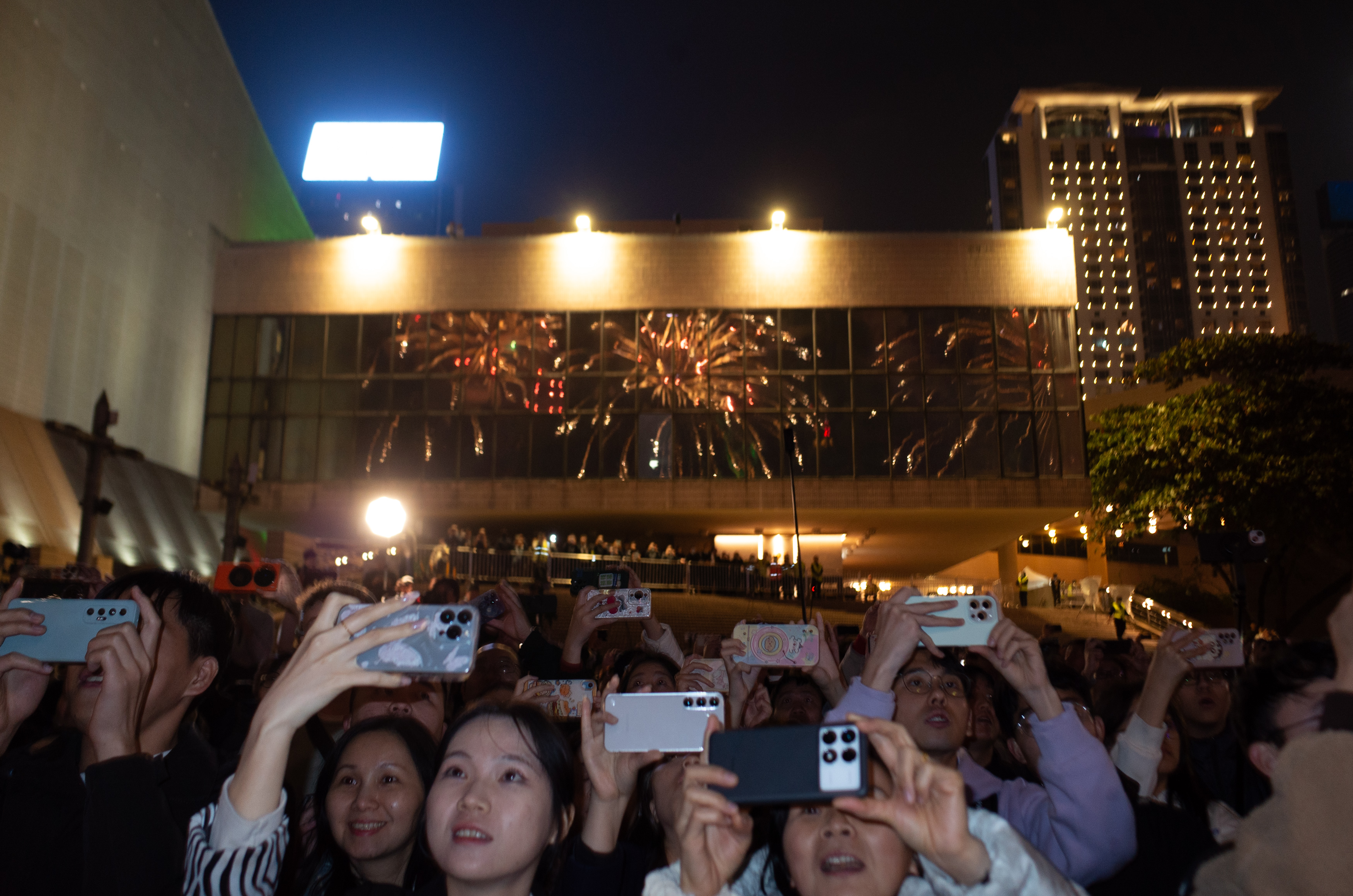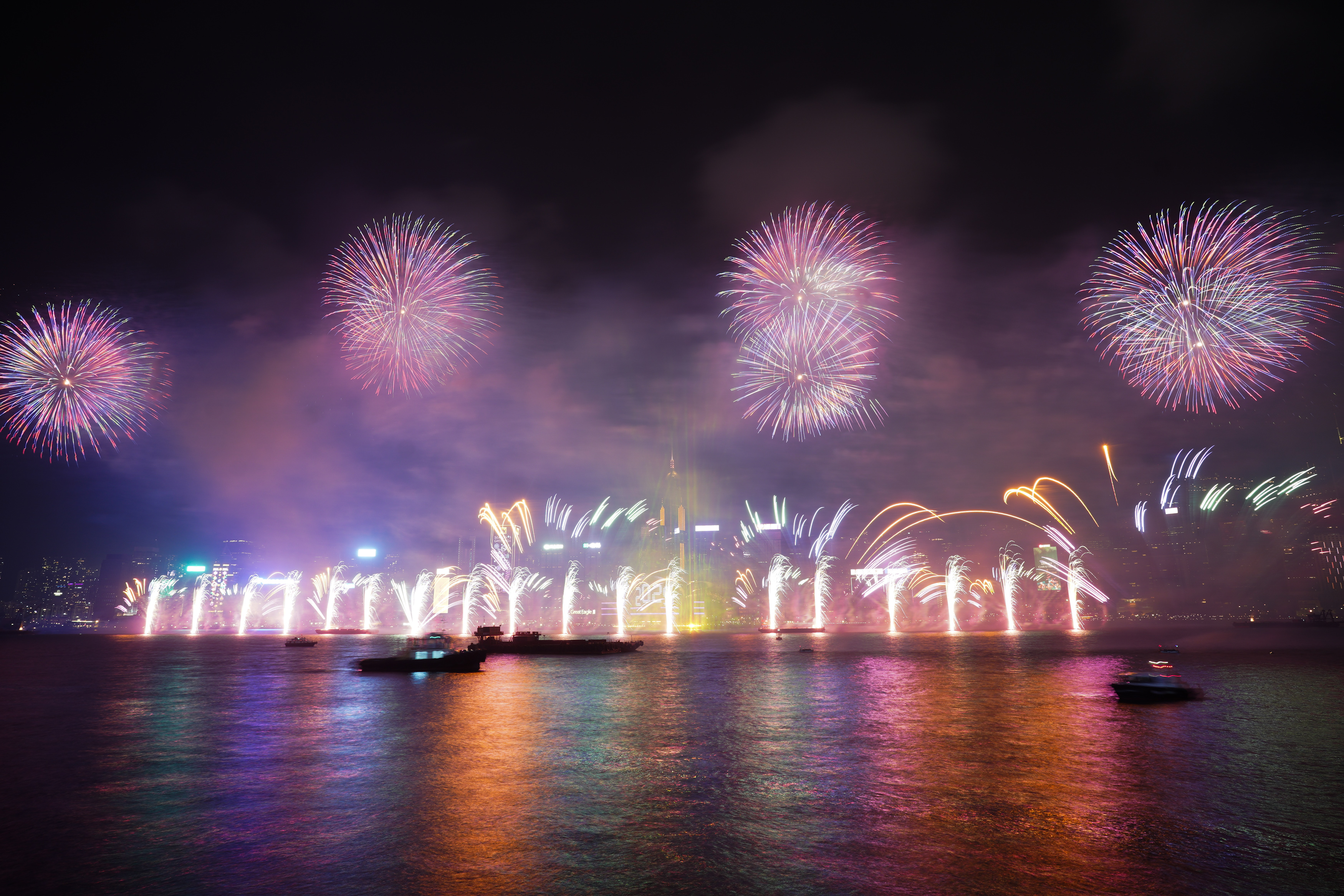 接近午夜時分,在眾人「5、4、3、2、1」齊齊的倒數聲中,海上躉船紛紛傳出陣陣炮聲,伴隨「Happy New Year」的歡呼聲,七彩繽紛的煙花迅即在中環至北角一帶的維港夜空中綻放,為新一年揭開序幕。