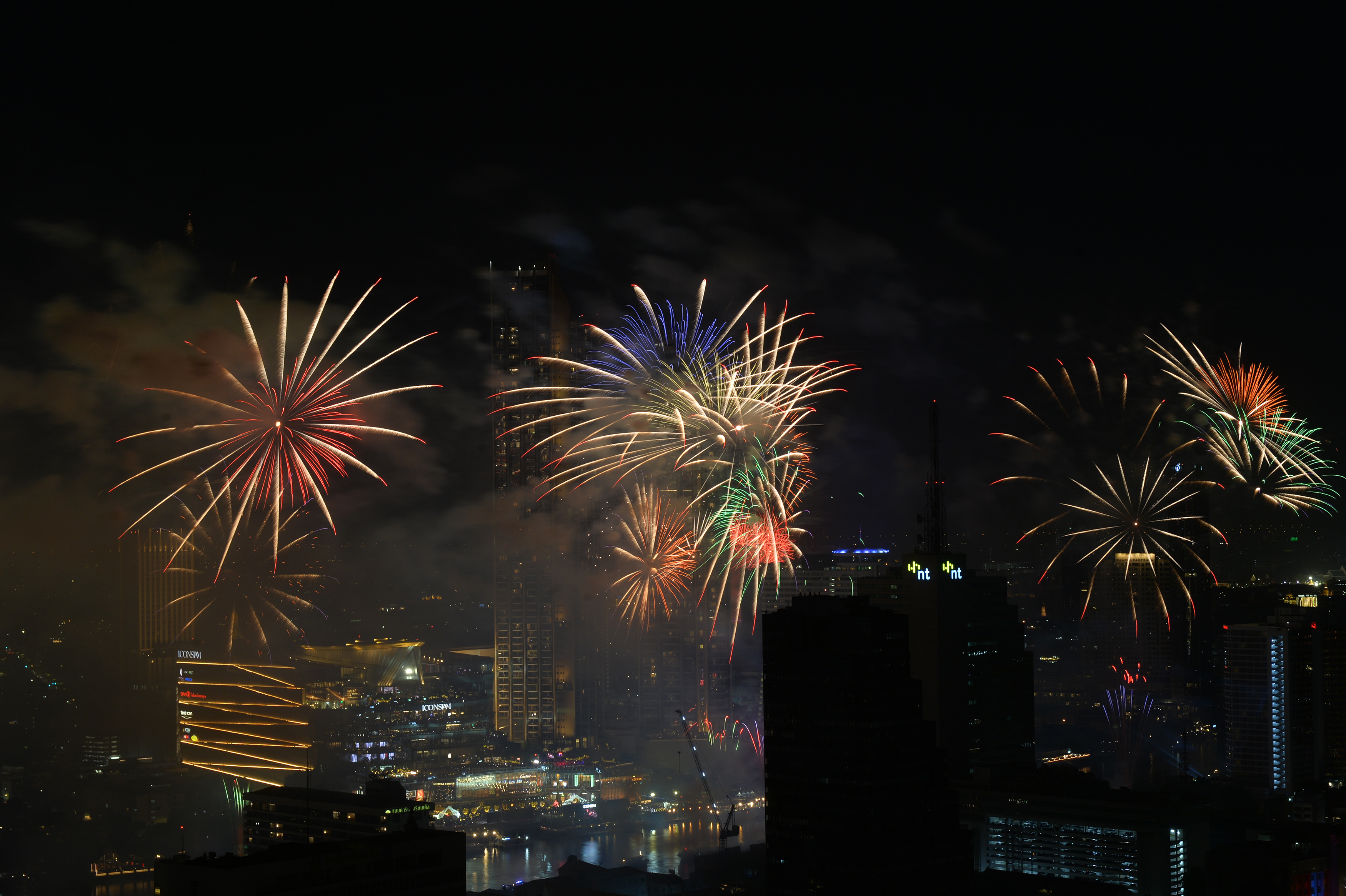 在泰國曼谷,璀燦的煙花照亮湄南河上的夜空。煙花匯演持續6分鐘,數萬枚以泰國糯米等環保材料製作的煙花在長達1400米的湄南河河道上空綻放,屬全球首創,以減少二氧化碳及有毒煙霧排放。