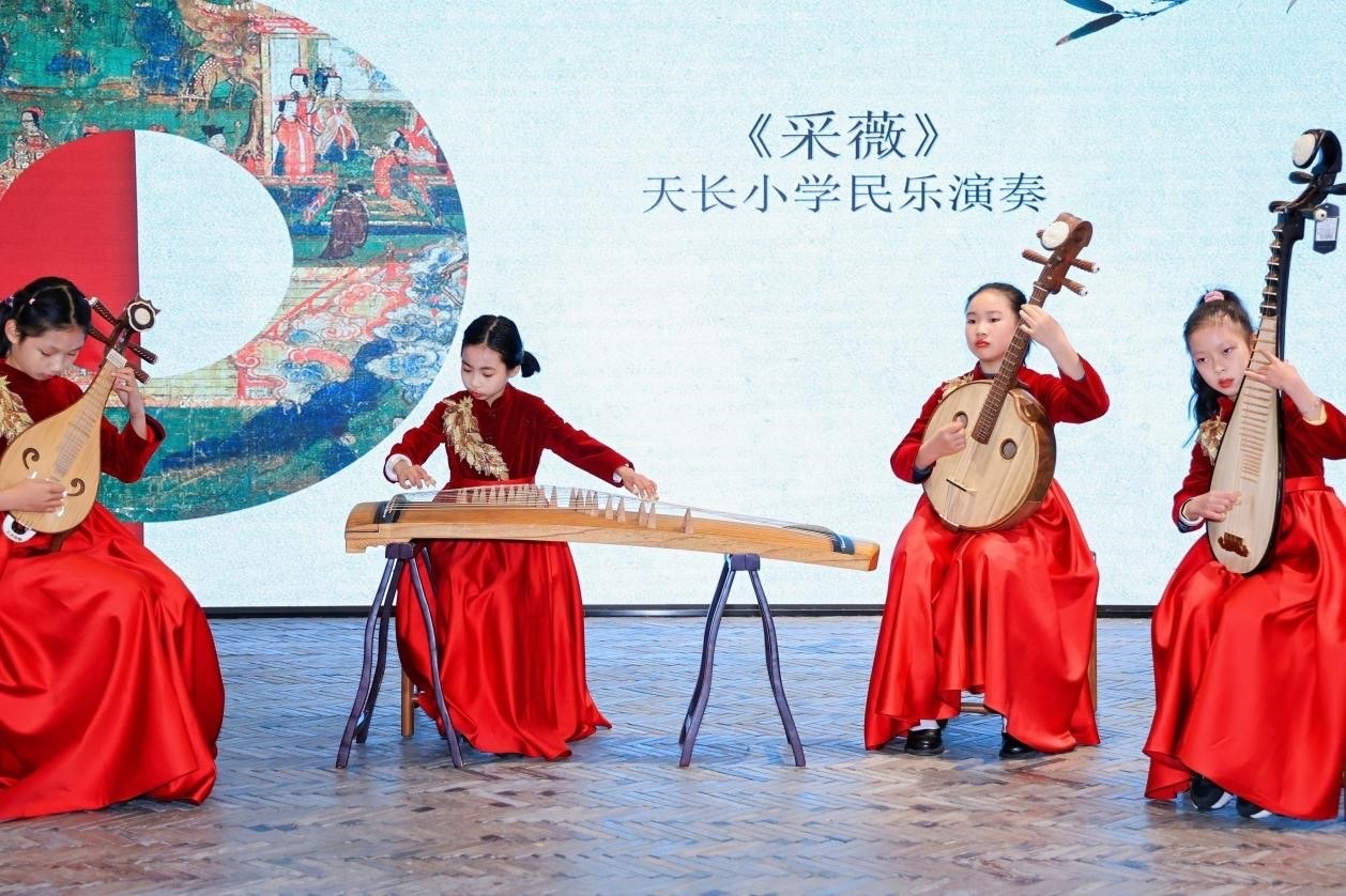活動現場,來自天長小學的中樂團以一曲悠揚的《採薇》開啟了全場盛宴。琴聲如流水,輕輕叩擊着在場觀眾的心弦,彷彿一瞬間將大家帶回了禮樂和鳴的時代。而朗誦團帶來的經典作品《長歌行》,則用稚嫩而堅定的童聲,將中華文化的雋永意蘊傳遞給每一位觀眾,全方位地呈現天長小學東坡文化課程成果。