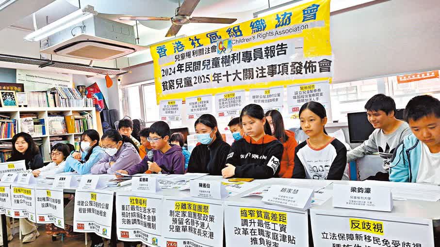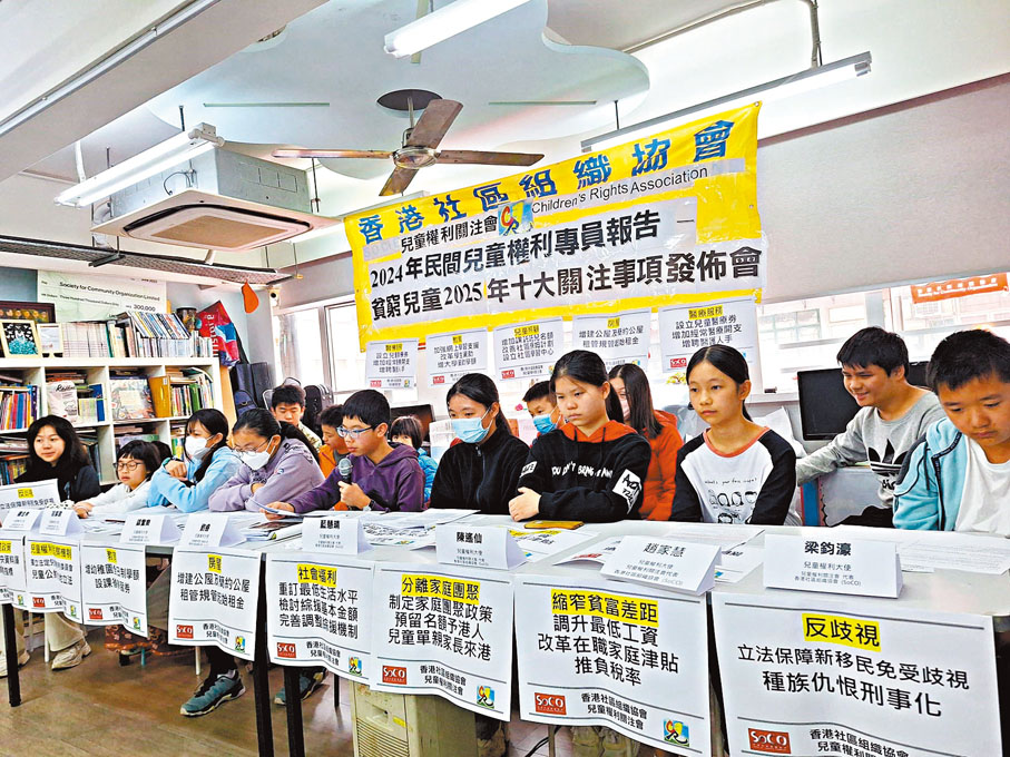 社協與兒童權利關注會昨日發表報告,兒童權利大使作為民間兒童權利專員,檢討過去一年香港兒童問題,分別探討各項兒童政策,並於2024年底透過兒童權利關注會內5,000多名會員(6歲至18歲)的討論及投票,投票選出2025年十大貧窮兒童關注政策。