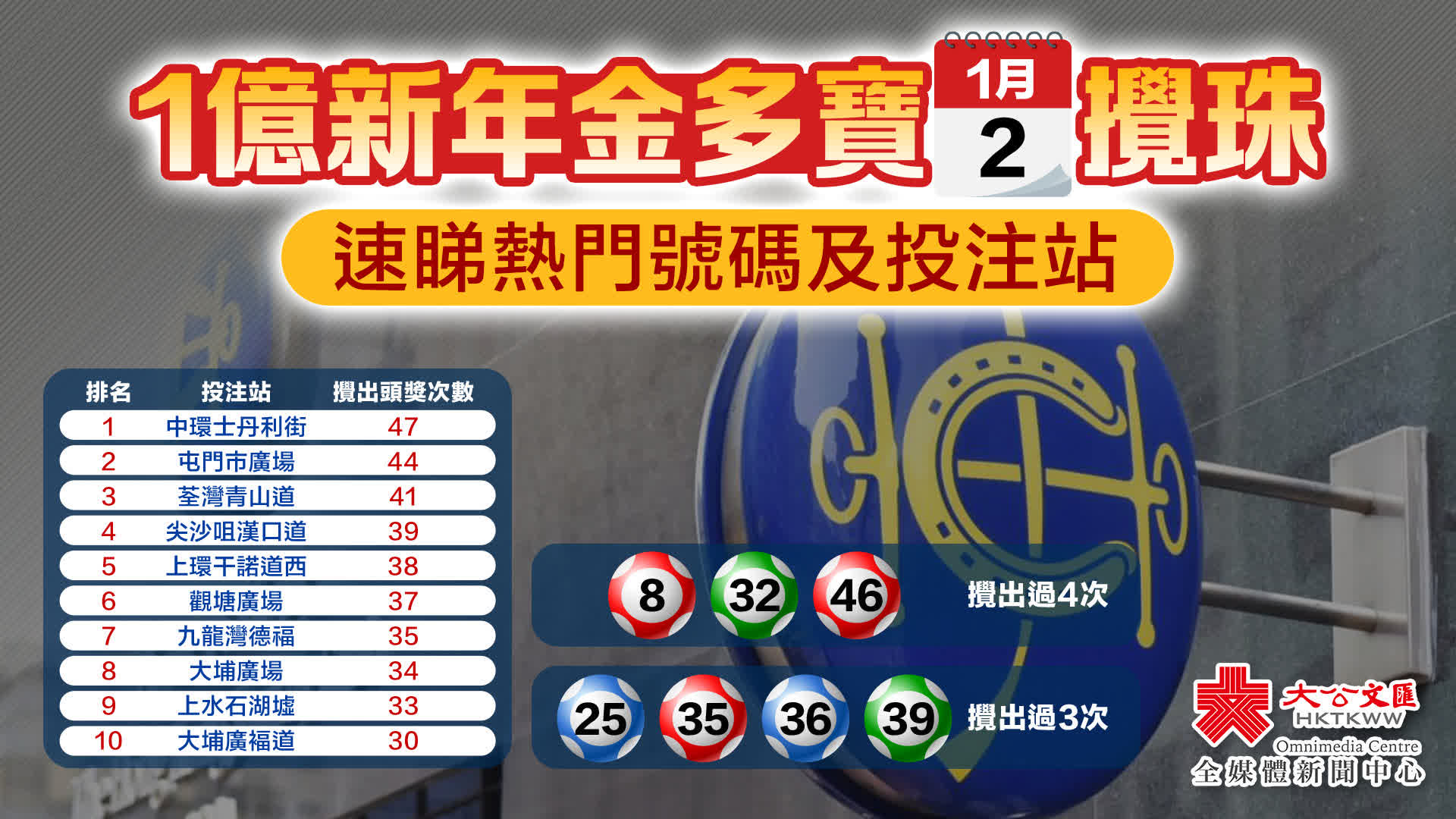 大公文匯全媒體報道,2025年六合彩首次攪珠將於今晚(2日)舉行,這更是六合彩新年金多寶2025,馬會估計頭獎基金高達1億元。大公文匯全媒體為你整理十大幸運投注站及過去11年六合彩新年金多寶熱門號碼。