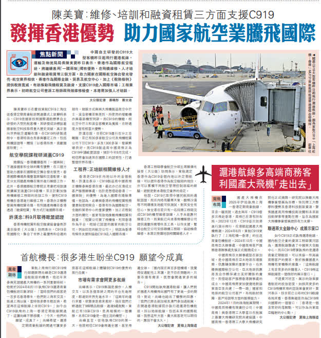 她續指,香港繼續善用「一國兩制」下連接國家和全球的獨有優勢,在三個方面助力國家在國際航空舞台發光發亮。香港國際機場具備豐富經驗和完善配套,能充分支持國產飛機在境外進行維修工作。此外,香港國際航空學院正考慮把培訓課程擴展至涵蓋C919客機,並正計劃加強飛機維修工程師的培訓工作,便利C919飛機在香港進行維修工程。香港亦正積極發展飛機租賃市場,有利國產飛機在香港透過「融資租賃」等方式打進國際市場。