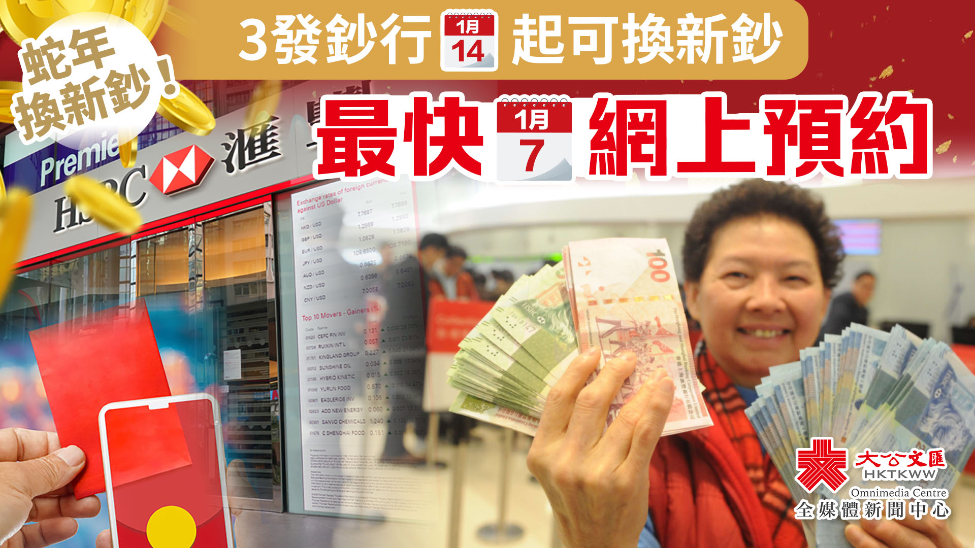 大公文匯全媒體報道,農曆新年將至,金管局連同滙豐銀行、渣打香港及中銀香港今日(2日)宣布,將於1月14日(周二)起至農曆年廿九(1月28日)提供新鈔及「迎新鈔」供市民兌換。網上預約將於下周二(1月7日)起開通,相關發鈔行會於下周內公布有關服務詳情。