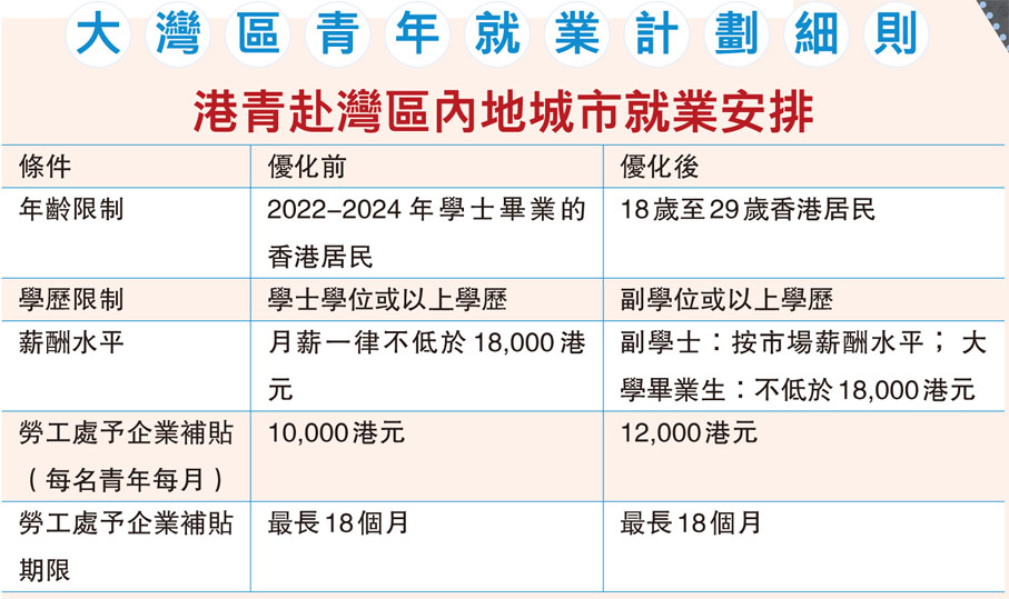 特區政府勞工處昨日宣布放寬大灣區青年就業計劃及展翅青年就業計劃兩項計劃的參加資格限制。其中大灣區青年就業計劃的參加資格放寬至18歲至29歲,以及持副學位或以上學歷,不再限制只有最近兩屆大學學位畢業生才合資格申請。參與計劃的企業每月獲政府發給津貼,務求讓企業以最少1.8萬港元月薪聘用合資格青年到內地工作;而政府向企業發放的津貼上限,則由每月1萬港元上調至1.2萬港元,為期最長18個月。