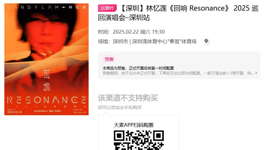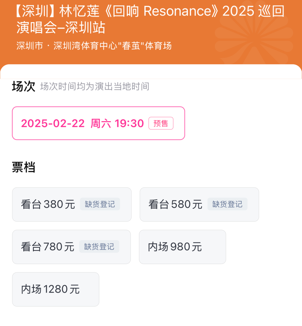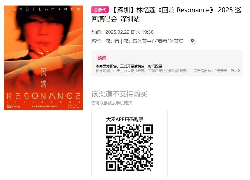 大公文匯全媒體報道,林憶蓮「迴響Resonance」2025巡迴演唱會首站深圳站將會在2月22日於深圳灣體育中心春繭體育場舉行,門票於1月2日在紛玩島優先購,1月3日分別在大麥和貓眼預售,門票價格為380元人民幣至1280元人民幣。作為「老歌」愛好者,點新聞記者今日(3日)亦參與購票,截至發稿,演唱會看台門票全部售罄,內場980蚊及1280蚊門票尚有餘票。