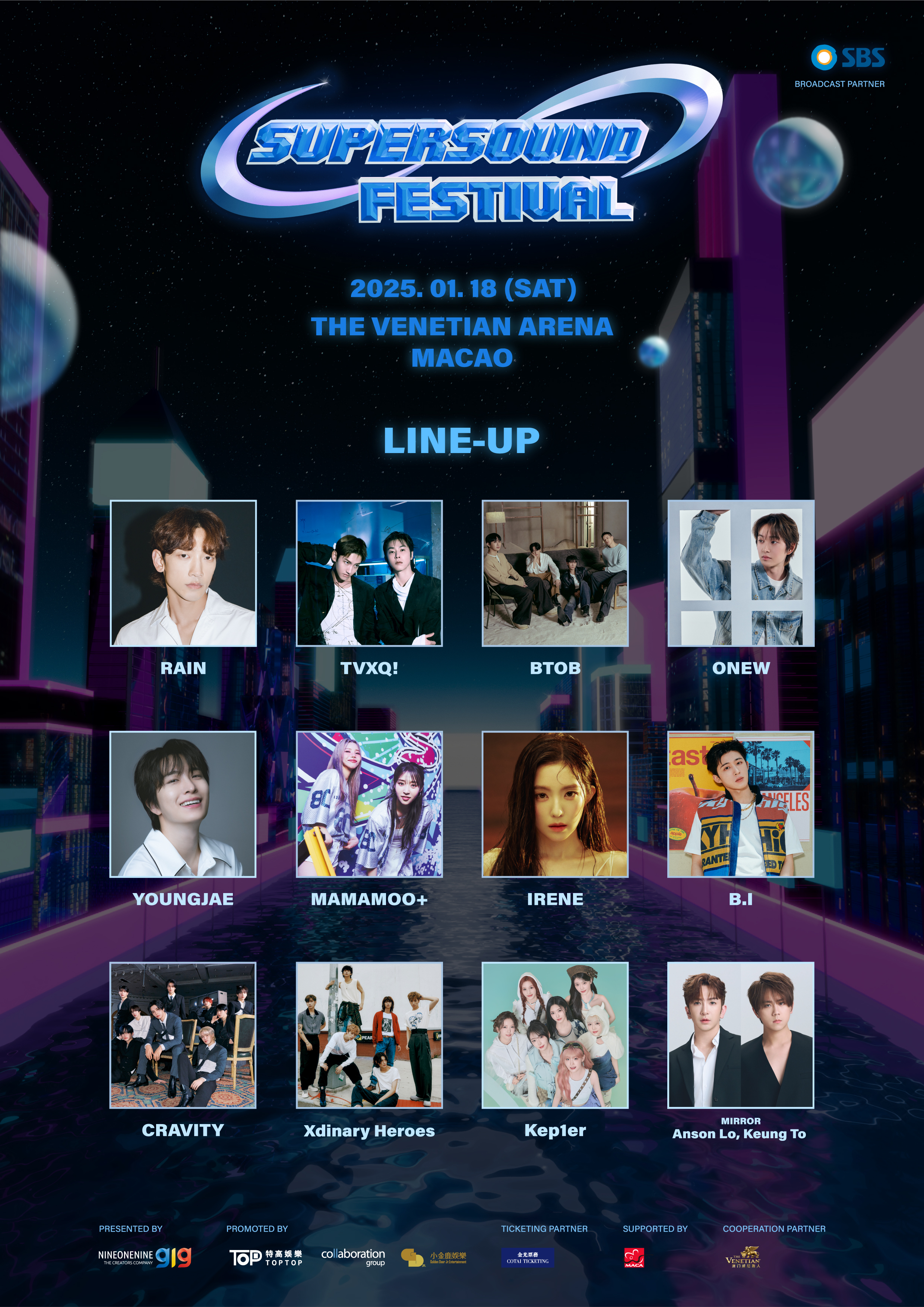 最終演出單位終極揭曉:B.l的音樂才子B.I以「大男孩感」的形象也深得了粉絲們的心,也將登上S舞台,還有香港樂壇組合MIRROR成員Anson Lo及姜濤也將首次親身亮相韓國音樂舞台,到澳門出席SUPERSOUND FESTIVAL的舞台上演出!