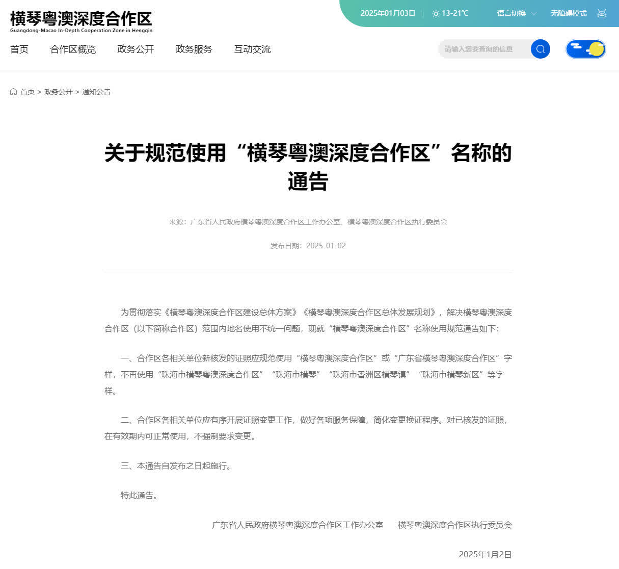 《通告》提出,合作區各相關單位新核發的證照應規範使用「橫琴粵澳深度合作區」或「廣東省橫琴粵澳深度合作區」字樣,不再使用「珠海市橫琴粵澳深度合作區」「珠海市橫琴」「珠海市香洲區橫琴鎮」「珠海市橫琴新區」等字樣。