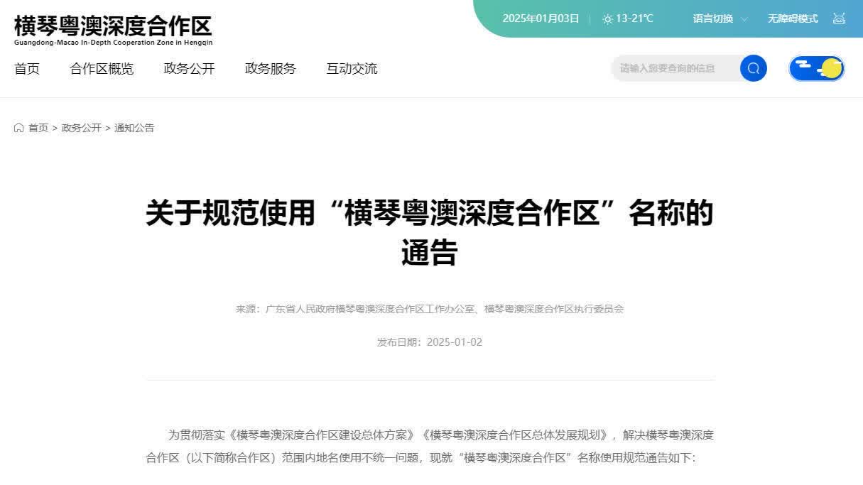 據「大灣區之聲」公眾號消息,近日,廣東省人民政府橫琴粵澳深度合作區工作辦公室、橫琴粵澳深度合作區執行委員會發布《關於規範使用「橫琴粵澳深度合作區」名稱的通告》,並自發布之日起施行。