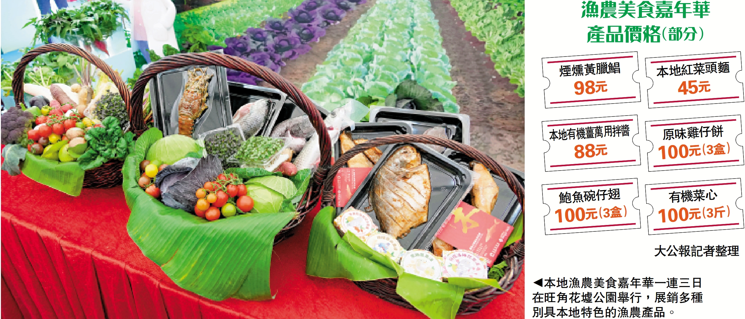 由漁農自然護理署、蔬菜統營處及魚類統營處合辦的嘉年華,420個攤位中超過220個售賣本地漁農產品,包括本地有機和水耕種植農產品,亦有青龍蝦、烏頭、羅非魚、藍瓜子斑等本地養殖的漁產品。