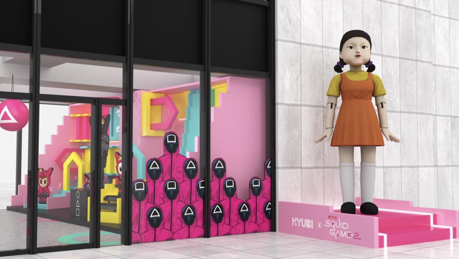除了「英熙」公仔外,活動還將包括一系列互動體驗和主題展覽,讓觀眾深入體驗《魷魚遊戲》世界,現場還會有帶着不同圖形面具的「遊戲管理員」現身現場,給遊客帶來沉浸式體驗。