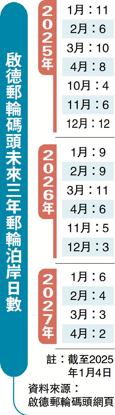 羅淑佩表示,啟德郵輪碼頭去年的郵輪停泊回復率已達2019年的73%,相比亞洲各郵輪碼頭20%至80%回復率,啟德碼頭已處於高位。她透露,考慮要求營運商承諾每年郵輪停泊達一定日數,「定一個數字可能未必很實際,但會不會是說我們要多少的日期,一年365天裏,我們要多少的日子?或者由競投承辦的公司建議,承諾有多少天拿到郵輪停泊?這些也是重要指標。」